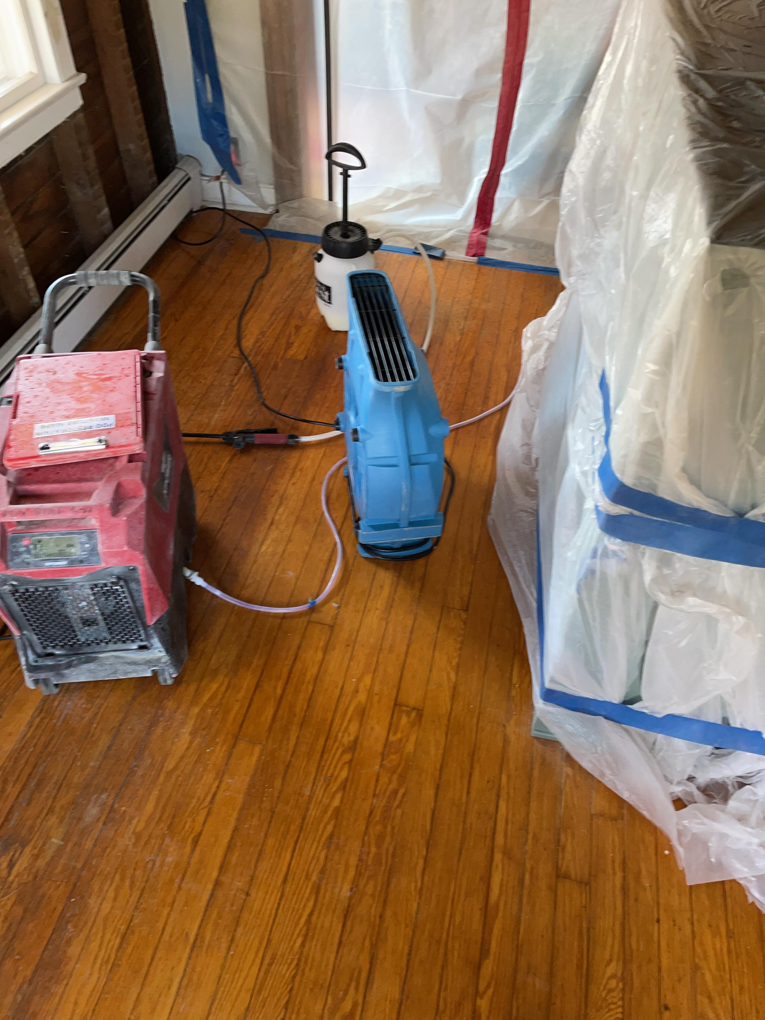 Packed up contents of room and removed rugs. Covered furniture and sealed off room with plastic covering. Set up an air scrubber.