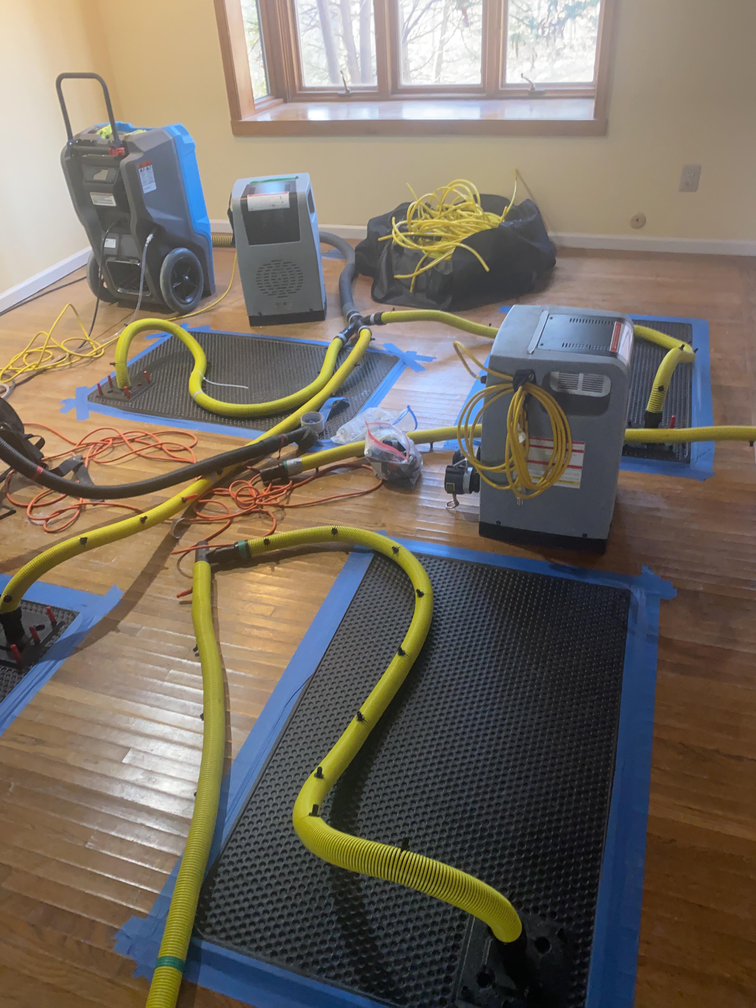 We boxed up all the content that was not damaged in the affected areas. We placed air scrubbers, air filters and dehumidifiers throughout the house. We used drying mats to remove moisture from their hardwood floors. We removed all damaged, drywall, ceiling and tiles. We removed the wet rug in the basement.