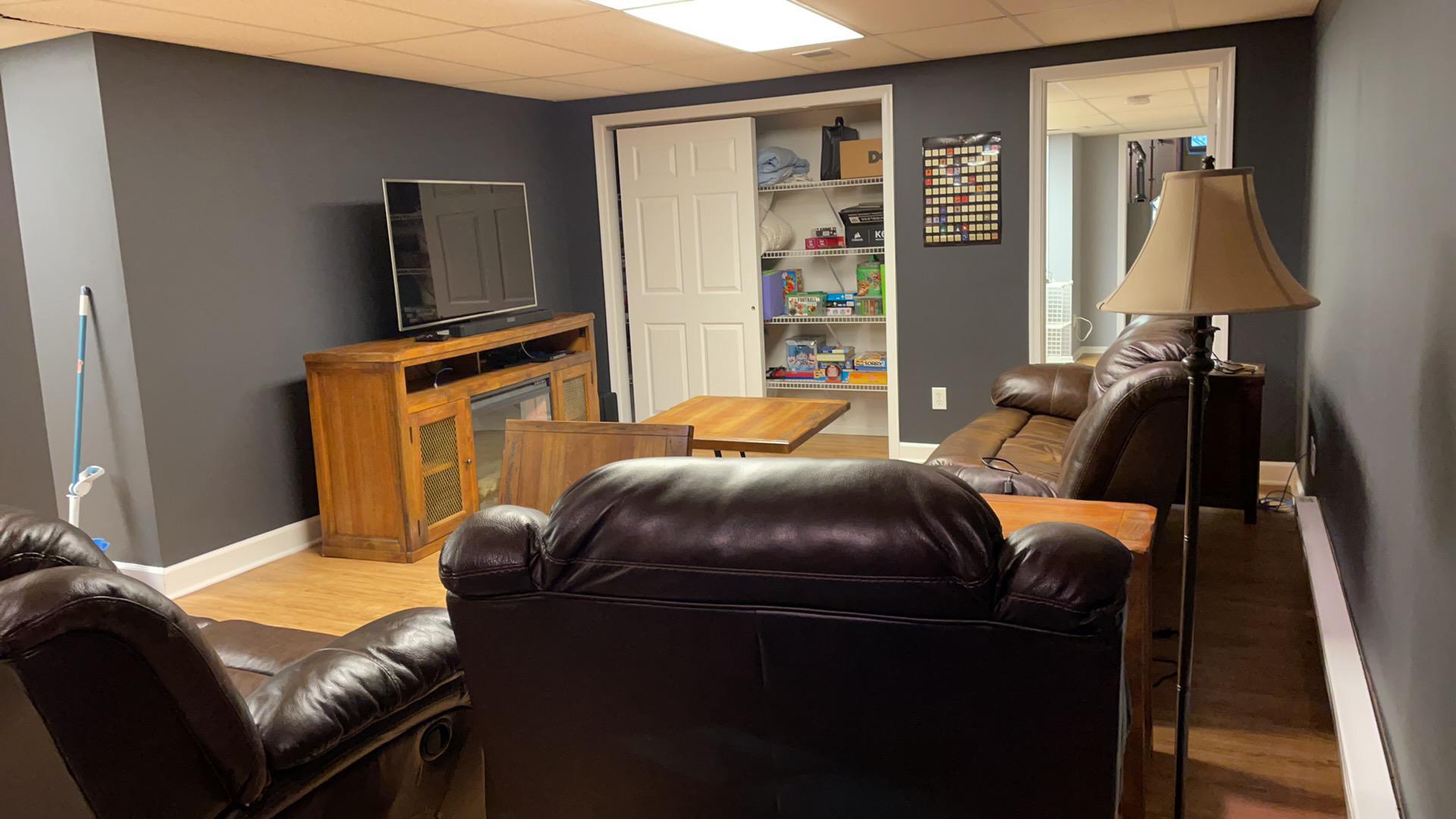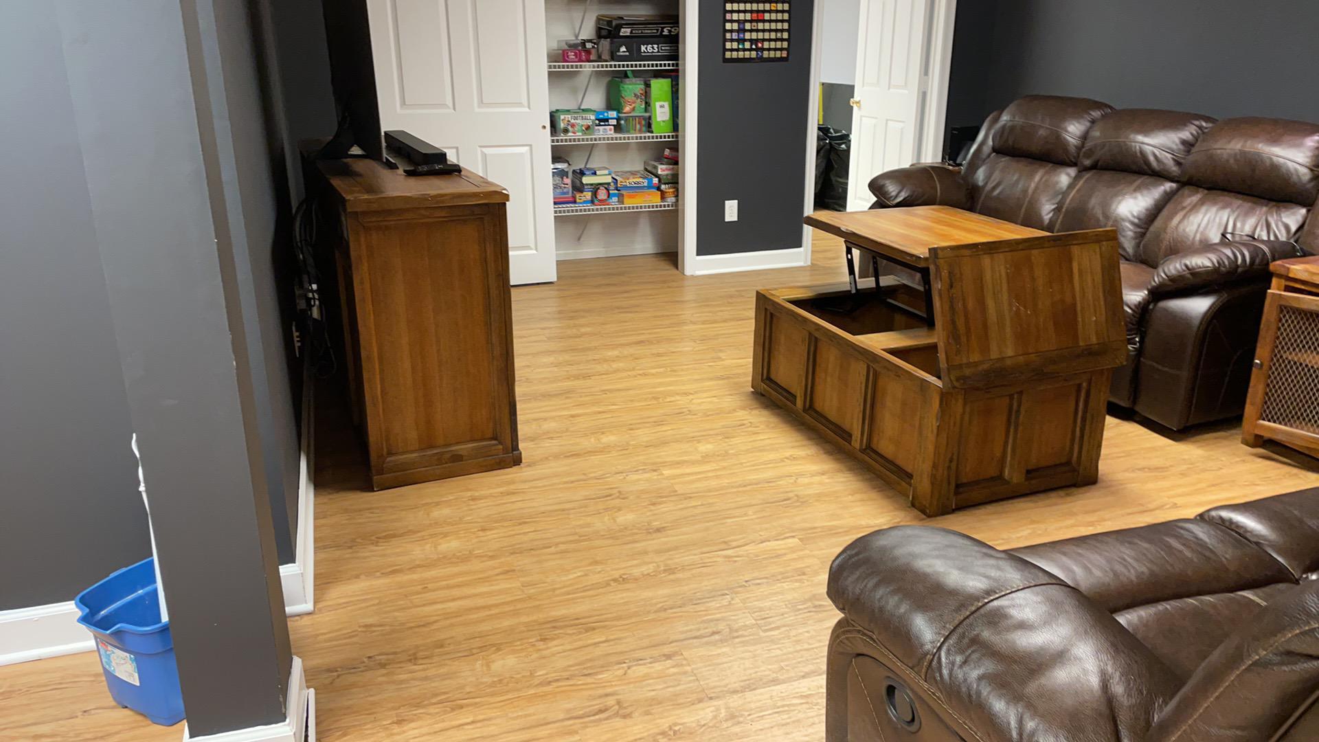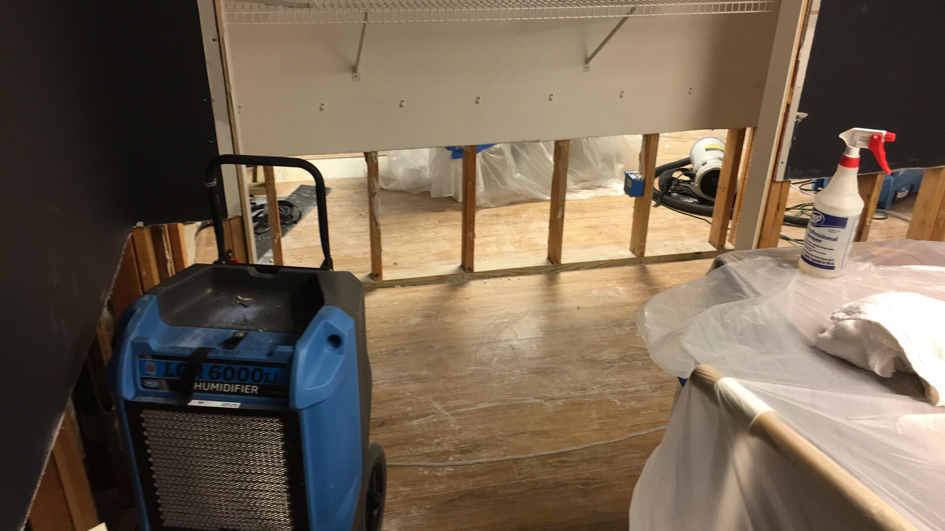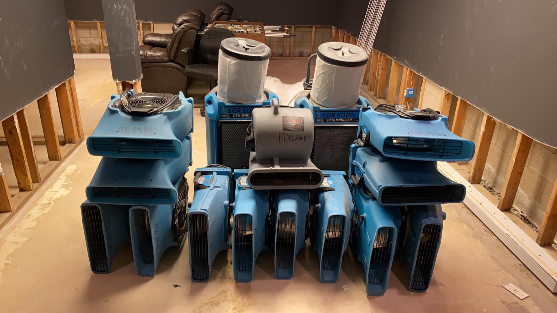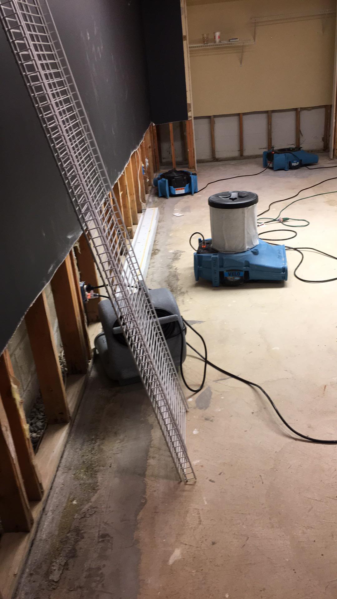Our IICRC-certified technicians set up high-velocity air movers, commercial dehumidifiers, HEPA air scrubbers and hydroxyls to begin drying their finished basement. We packed up their unaffected content and moved it to a dry area of their home. We sealed off the affected area, covered to protect their unaffected furniture. We removed all the affected materials.