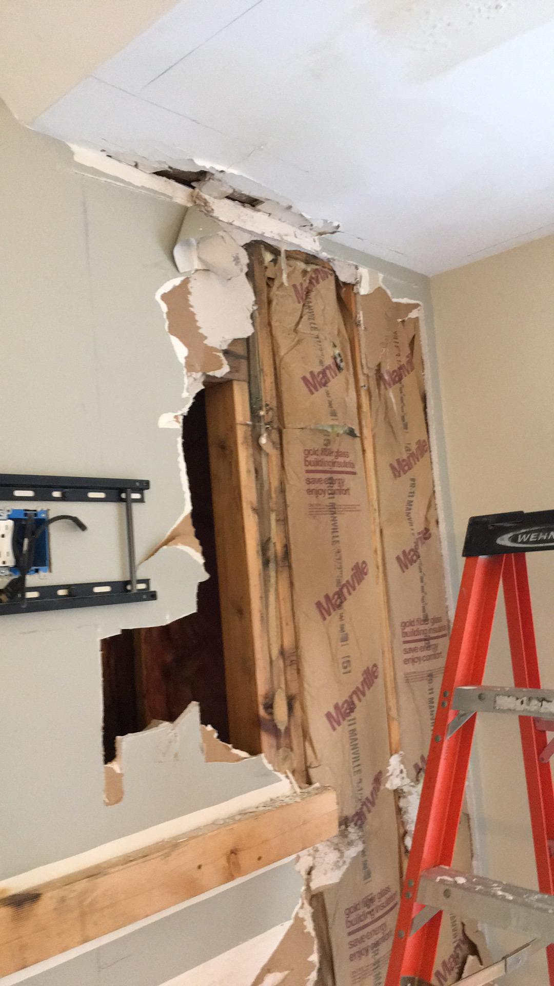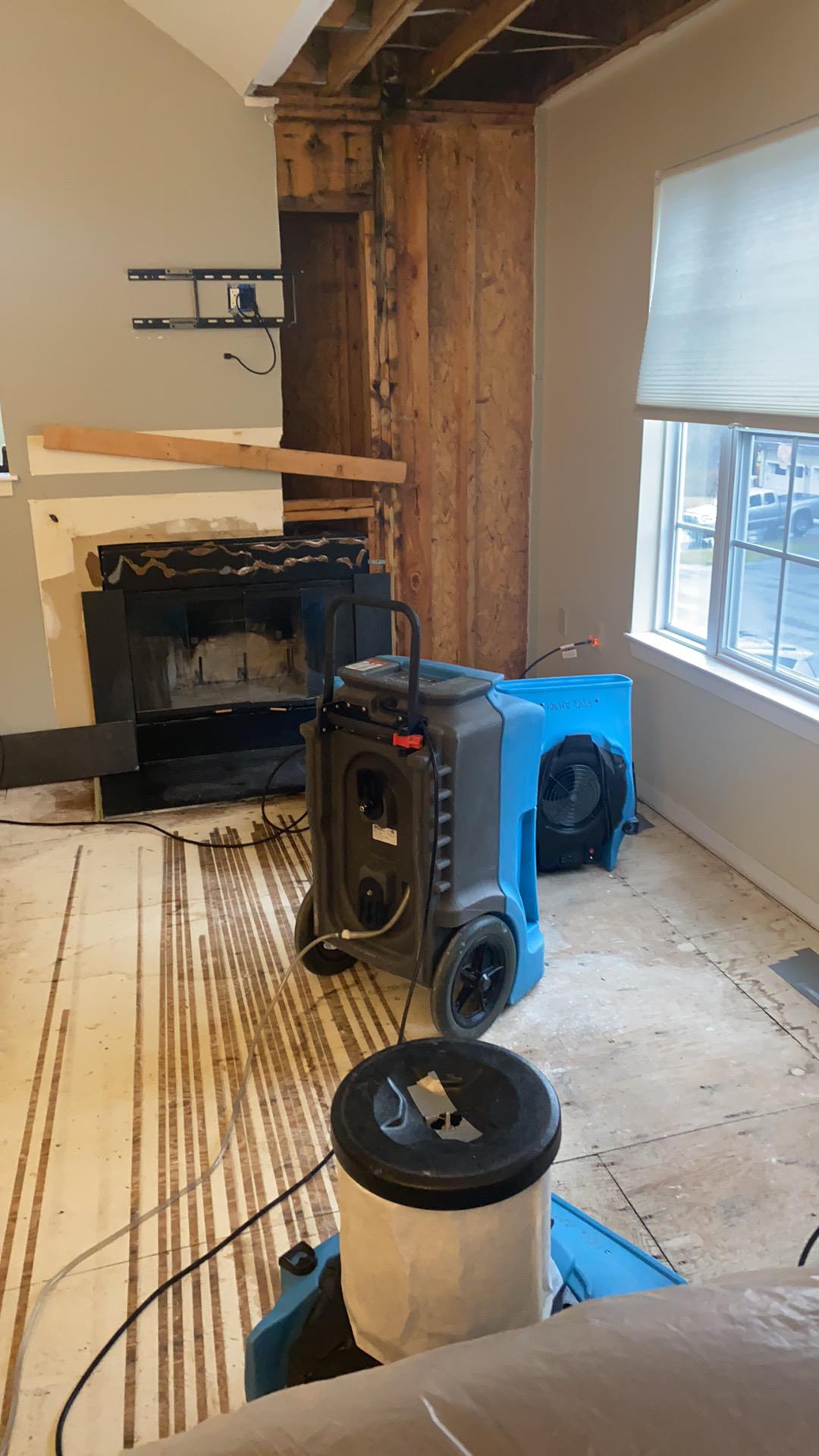 The Client from New Vernon, NJ was referred to us through a friend. They had a roof leak. Snow piled up along the roof and chimney, causing damage to the vaulted ceiling and under the laminate flooring. The homeowners main concern was how quickly we could begin the drying process.