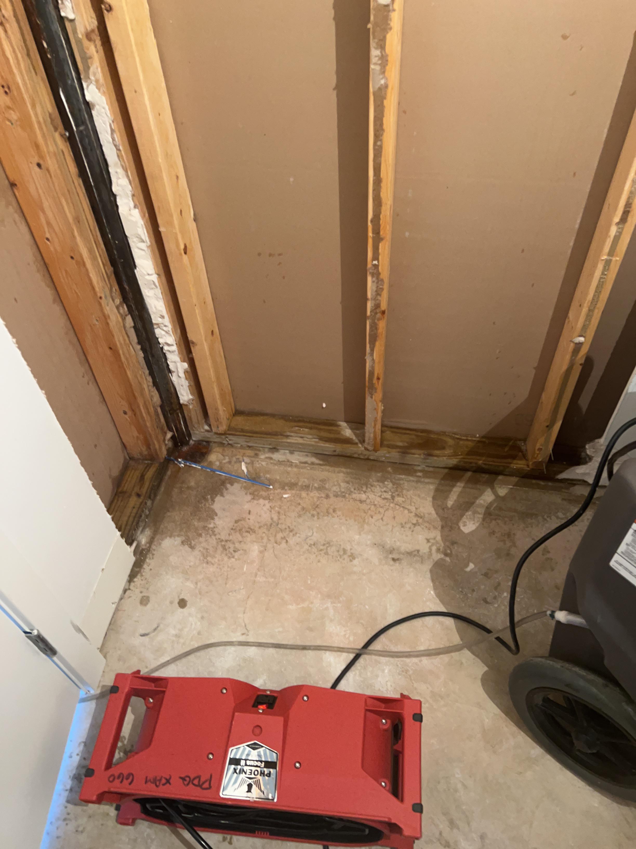 The base molding in the boiler room was removed undamaged and put to the side. 2 air movers pointed up and 1 fan pointed at affected area in boiler room.
