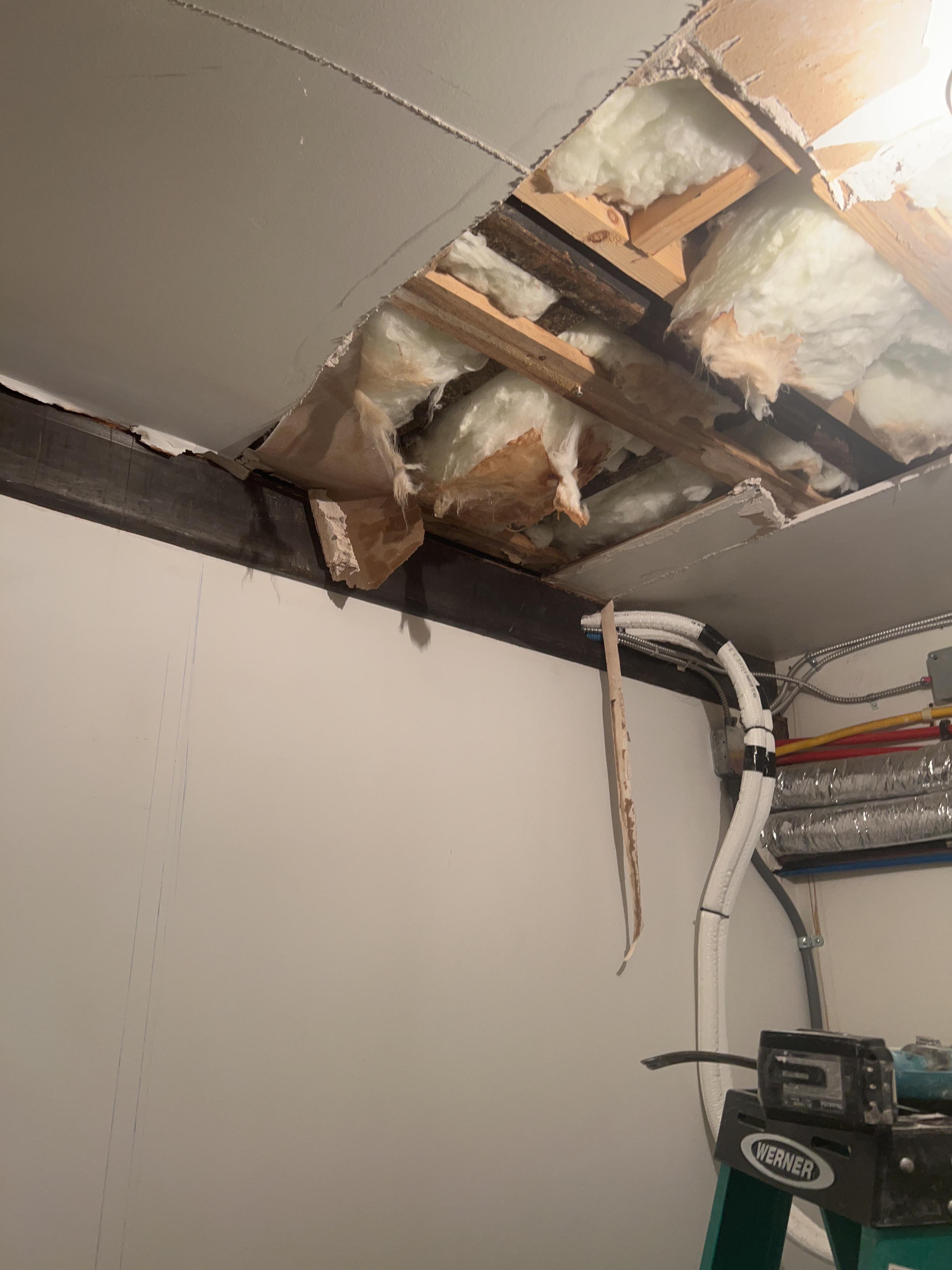 They installed 5 injecta dry mats in the bedroom upstairs. In boiler room, they made cuts in ceiling and wall to remove damaged materials. Insulation was found in the ceiling; it was wet and removed.