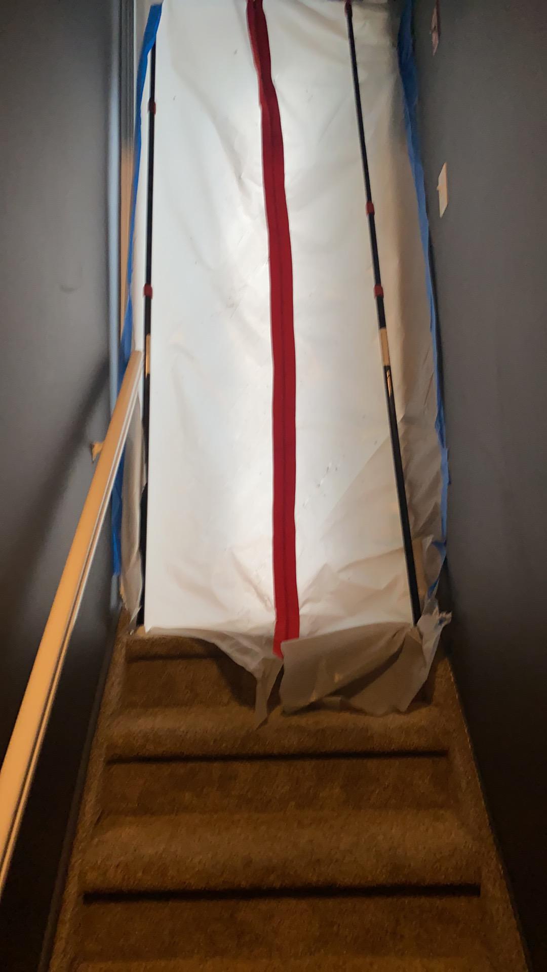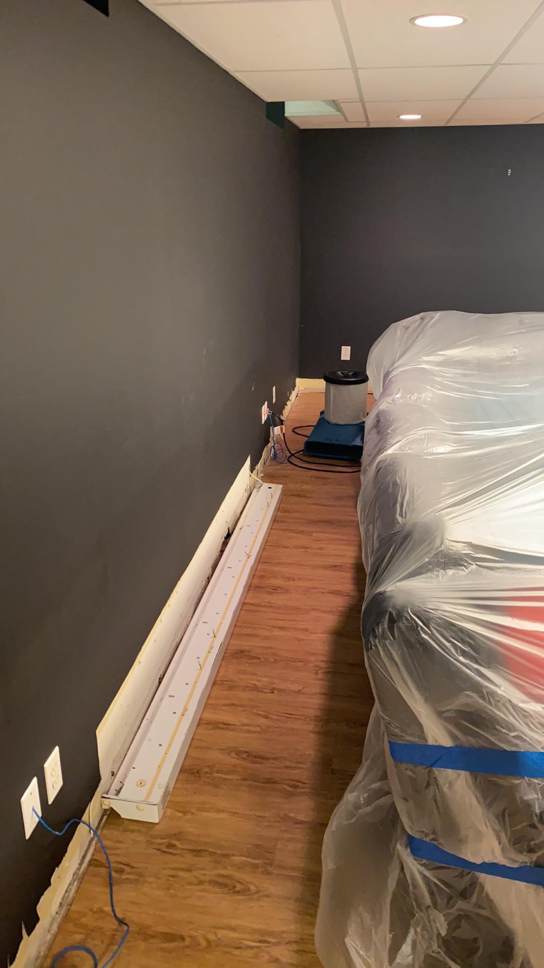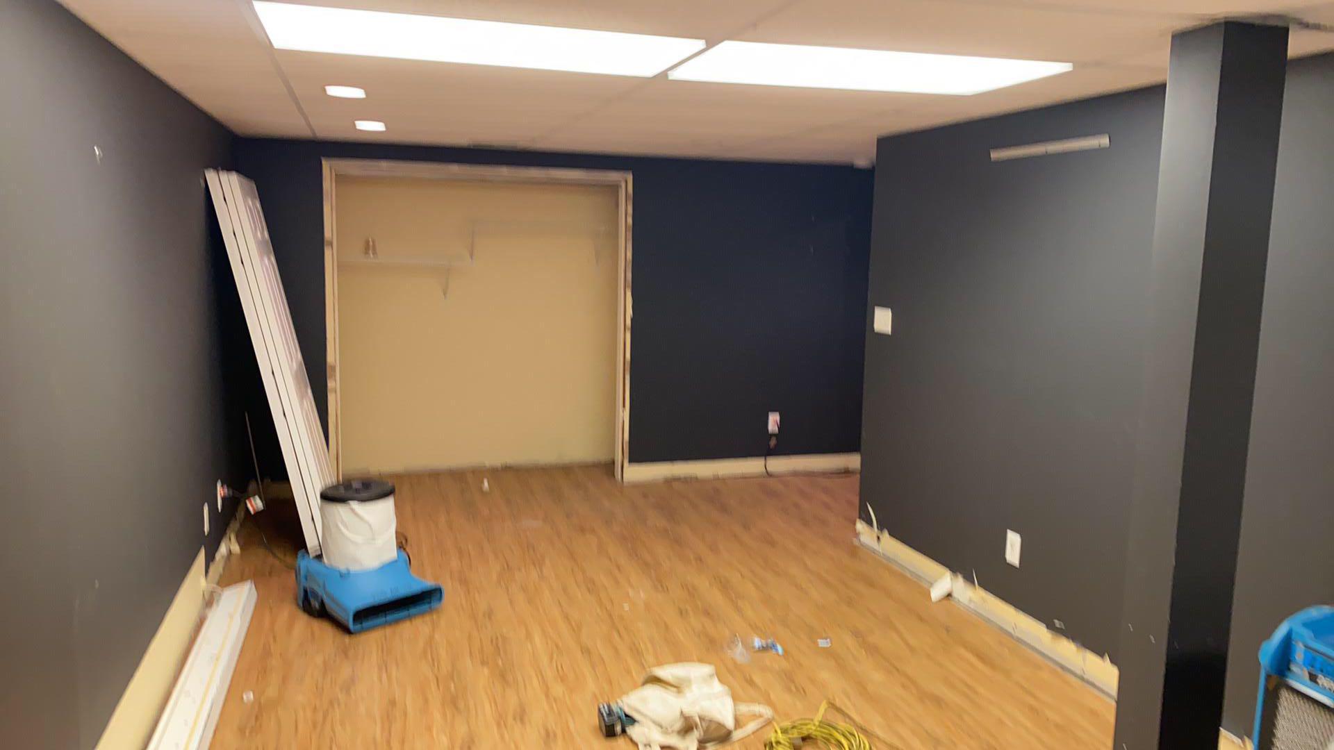 Our IICRC-certified technicians set up high-velocity air movers, commercial dehumidifiers, HEPA air scrubbers and hydroxyls to begin drying their finished basement. We packed up their unaffected content and moved it to a dry area of their home. We sealed off the affected area, covered to protect their unaffected furniture. We removed all the affected materials.