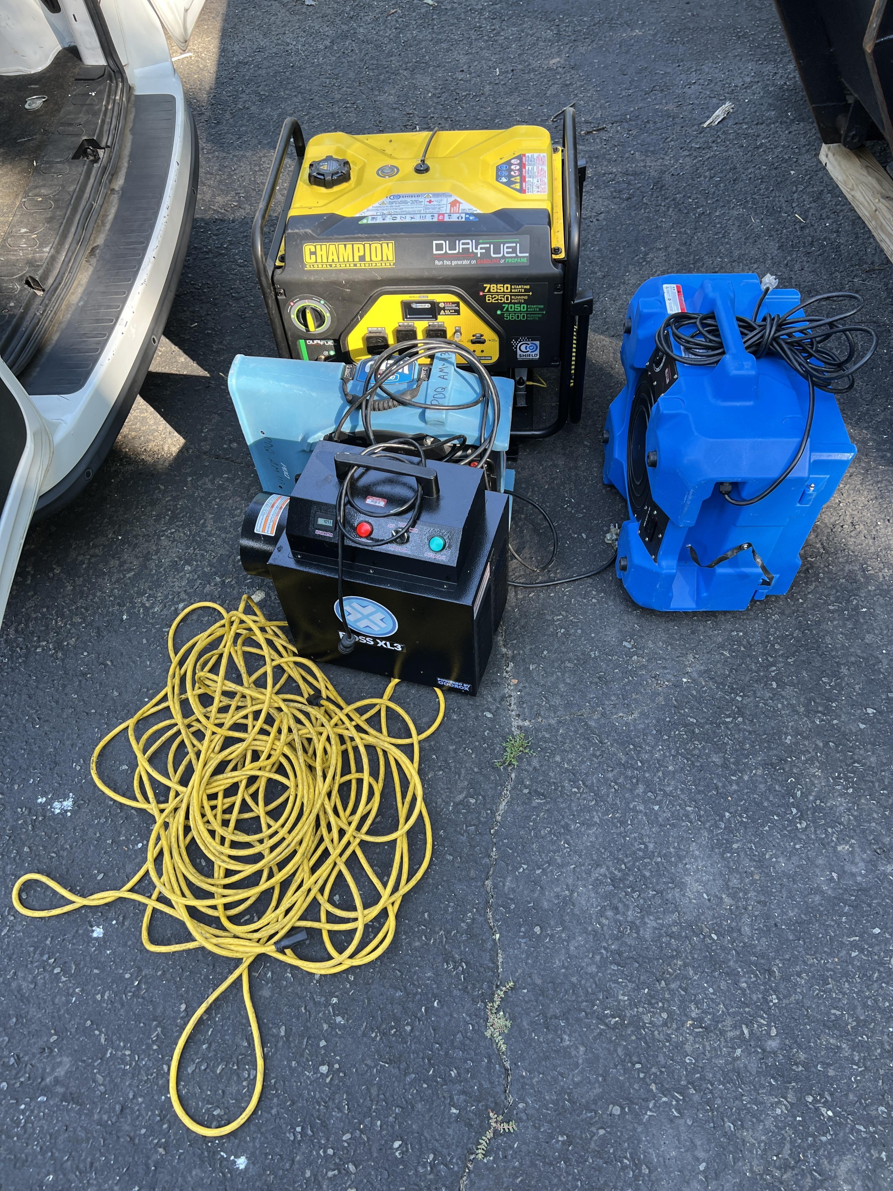 Removed the carpeting from the basement bedroom. We set up a generator, Air Scrubber, Hydroxyl Unit, Fan and cleaning supplies.
