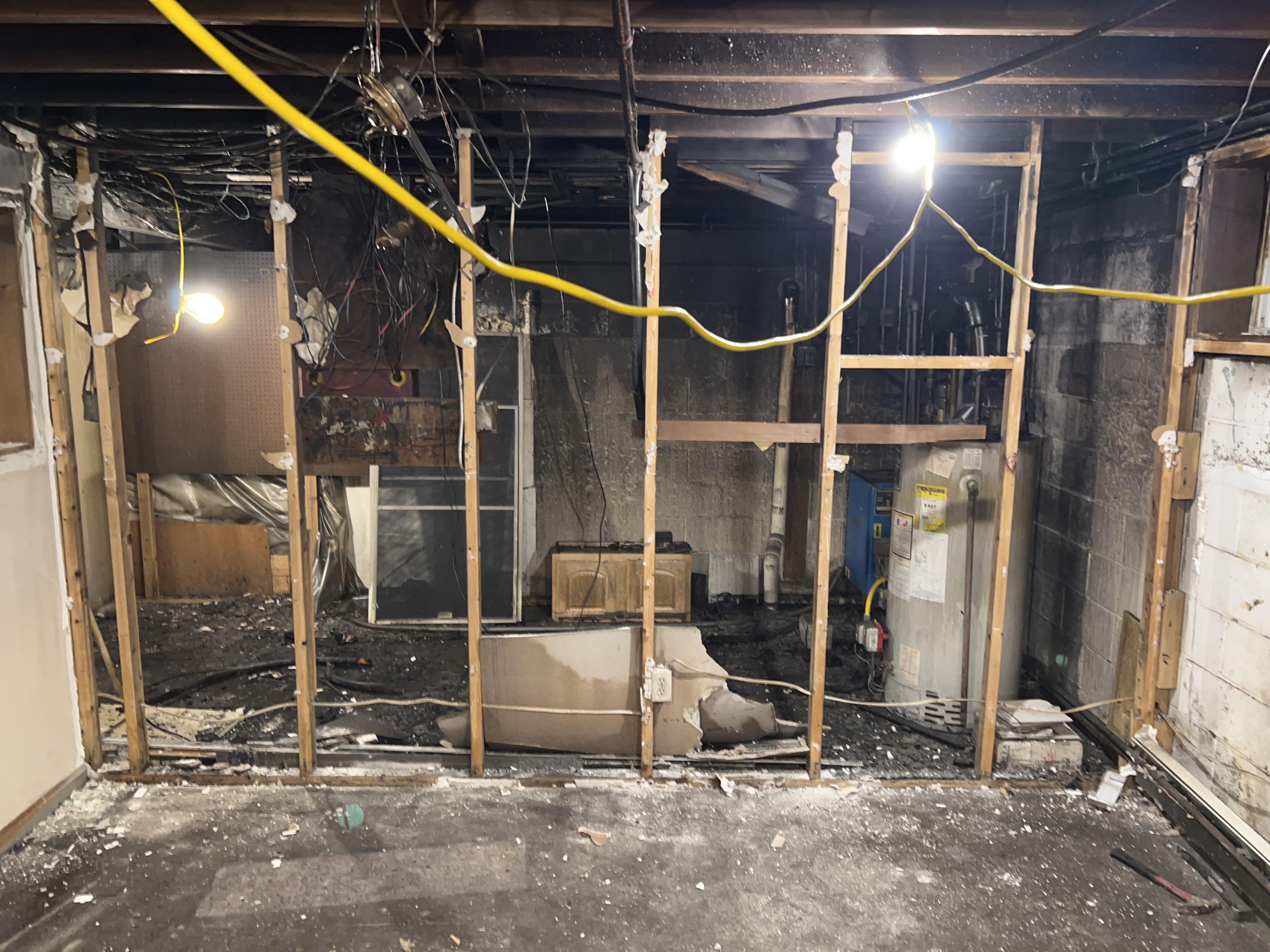 PDQ immediately began the demolition process in the fire-damaged basement, while wearing personal protective equipment. We removed all debris and damaged walls and ceilings. Worked in the hallway going downstairs to the basement and provided full clean-up. Ordered dumpster for all damaged contents to be removed. and thrown out. Clean-up and repair of smoke, soot, and water-damaged rooms was completed.