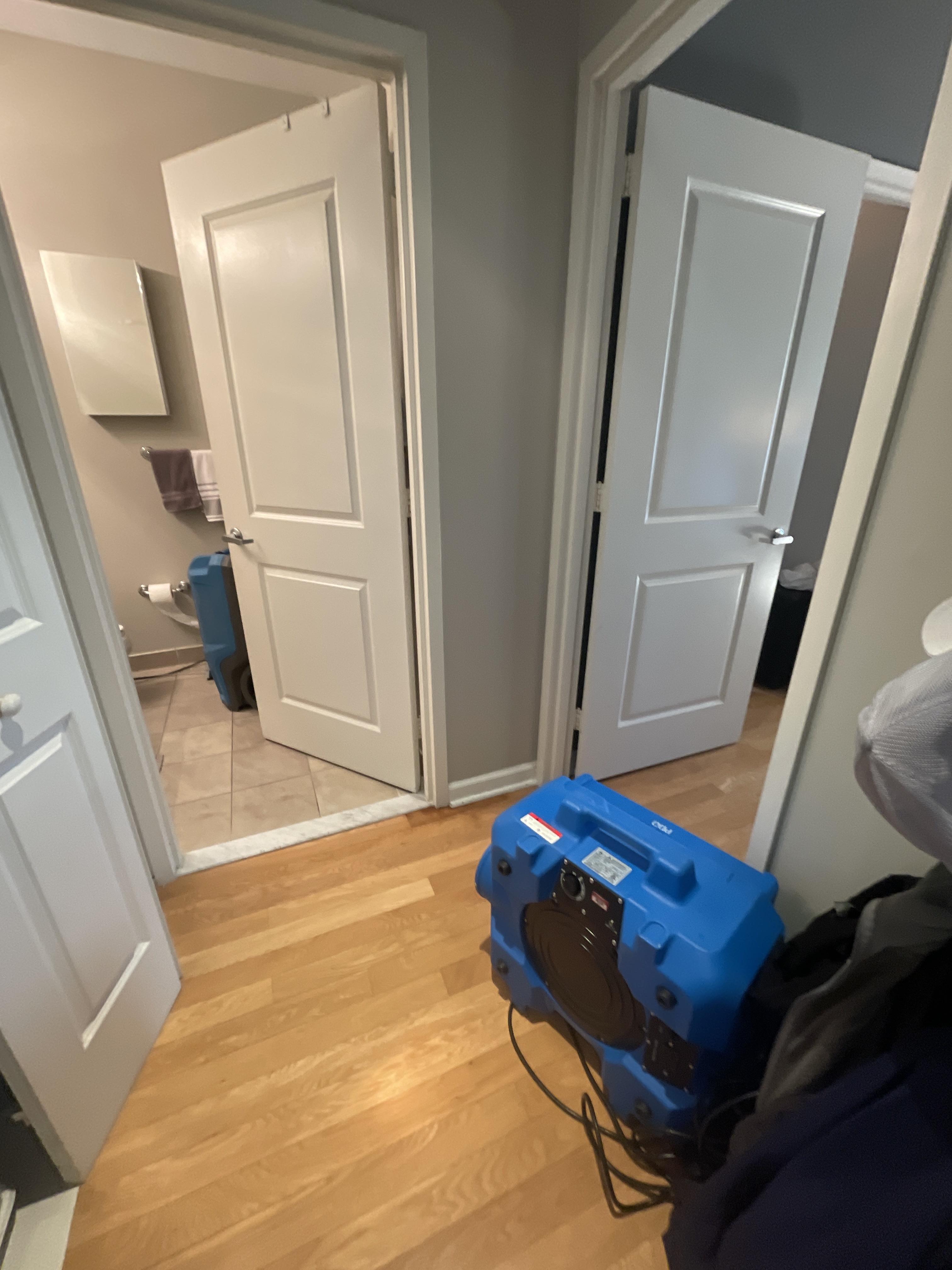 Due to the documented elevated moisture readings, structural drying services were provided to the affected areas. Proper containment and air scrubber(s) were used. Some of the flooring and sheetrock in the hallway between the bathroom and bedroom needed replacement at the home in Andover, New Jersey.