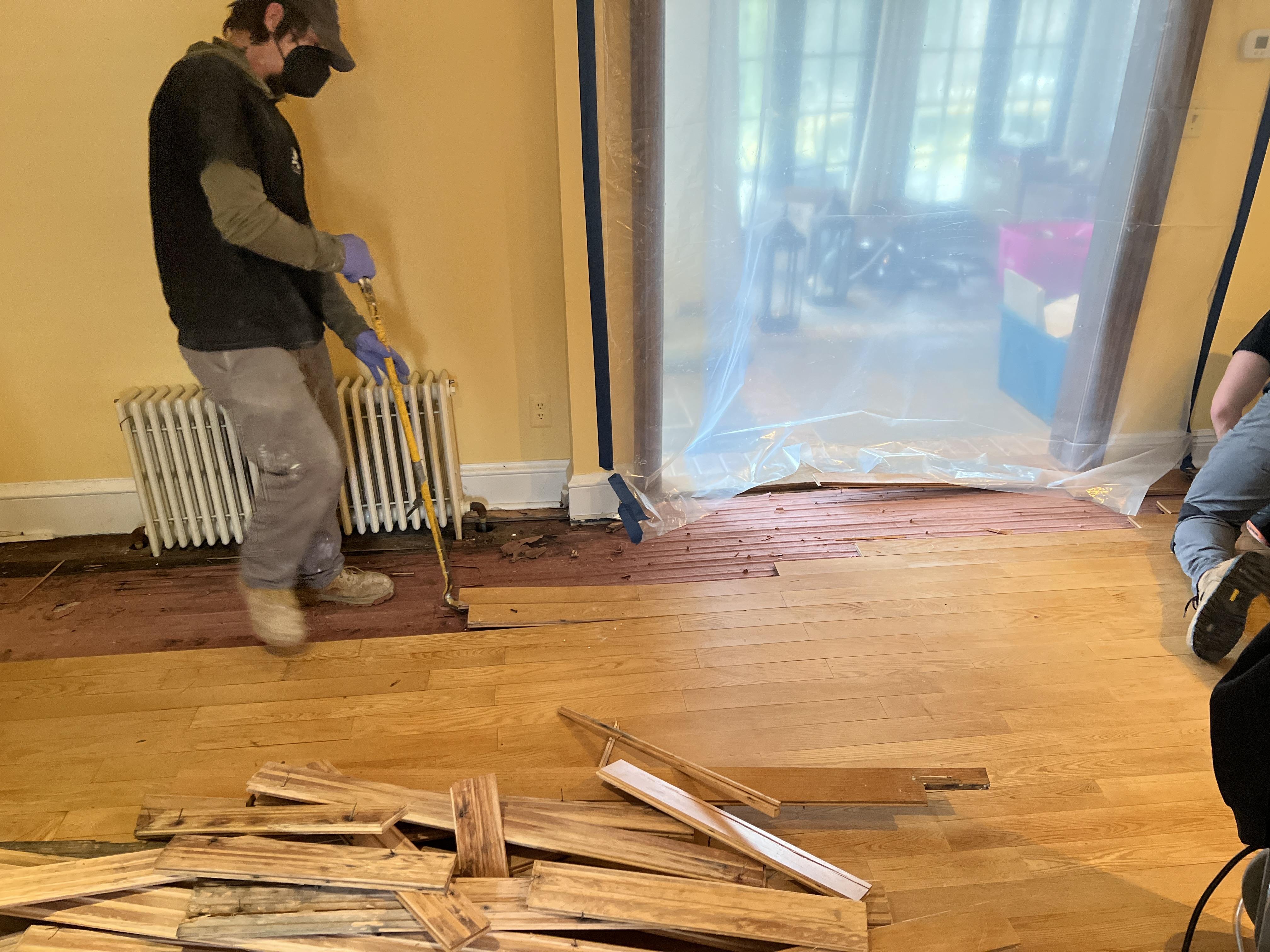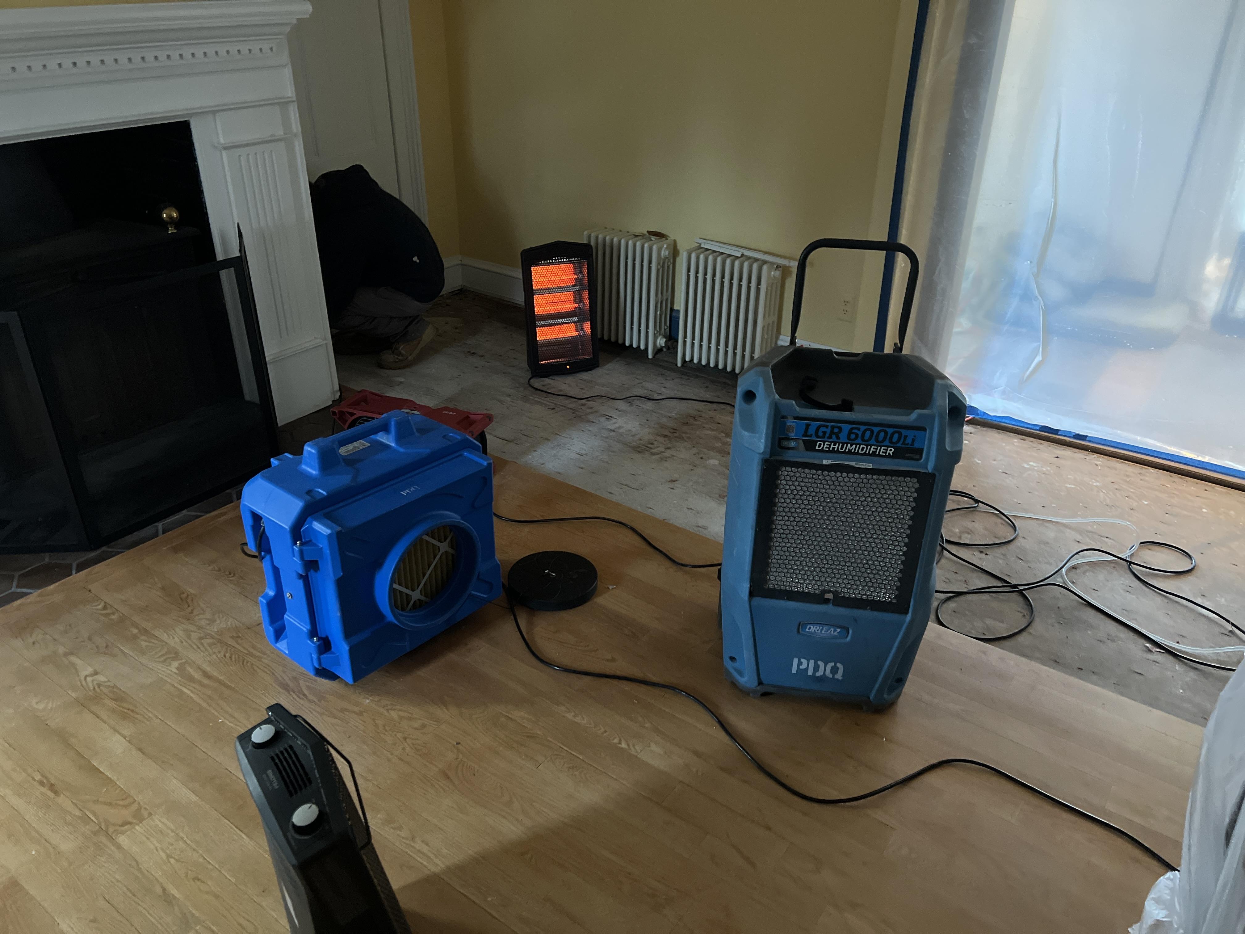 In the kitchen, we covered all the cabinets and floor in plastic to protect it from any debris or dust at the home in Chester, New Jersey. The same goes for the home office, where the radiator had exploded. We covered the fireplace and bookshelf in the office with painter's plastic. A partial removal of the floor in the living room was also done. A section of the kitchen ceiling was removed to reveal the burst pipe. PDQ sprayed microbial and placed multiple dehumidifiers, fans, and air scrubbers to dry out the damp and saturated spaces.