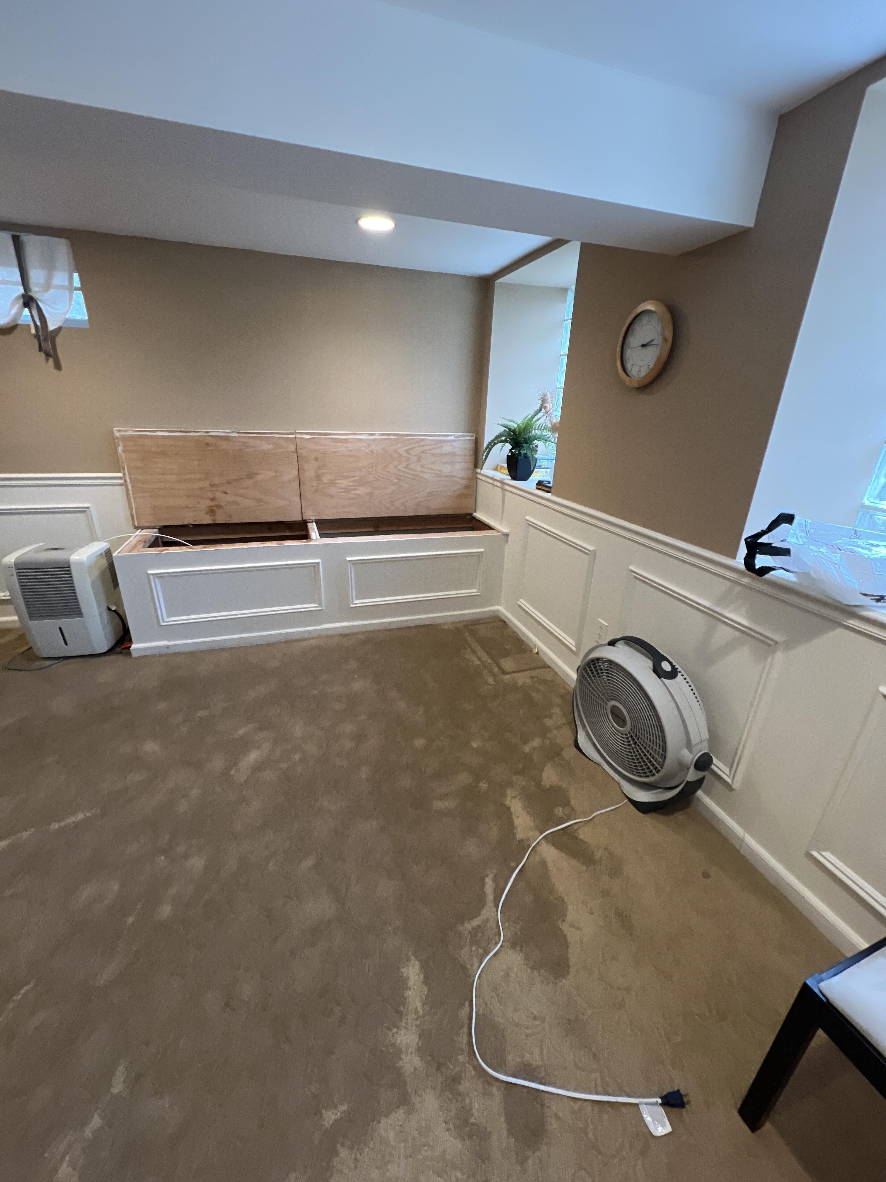 PDQ came in and set up containment to create a drying chamber in the basement in order to dry it out as efficiently as possible. All water in carpet was extracted. Carpet was disengaged at the seams and floated so fans could blow underneath. Dehumidifiers were also set up to help bring the moisture levels down. Flood cuts were performed throughout the perimeter of the basement.