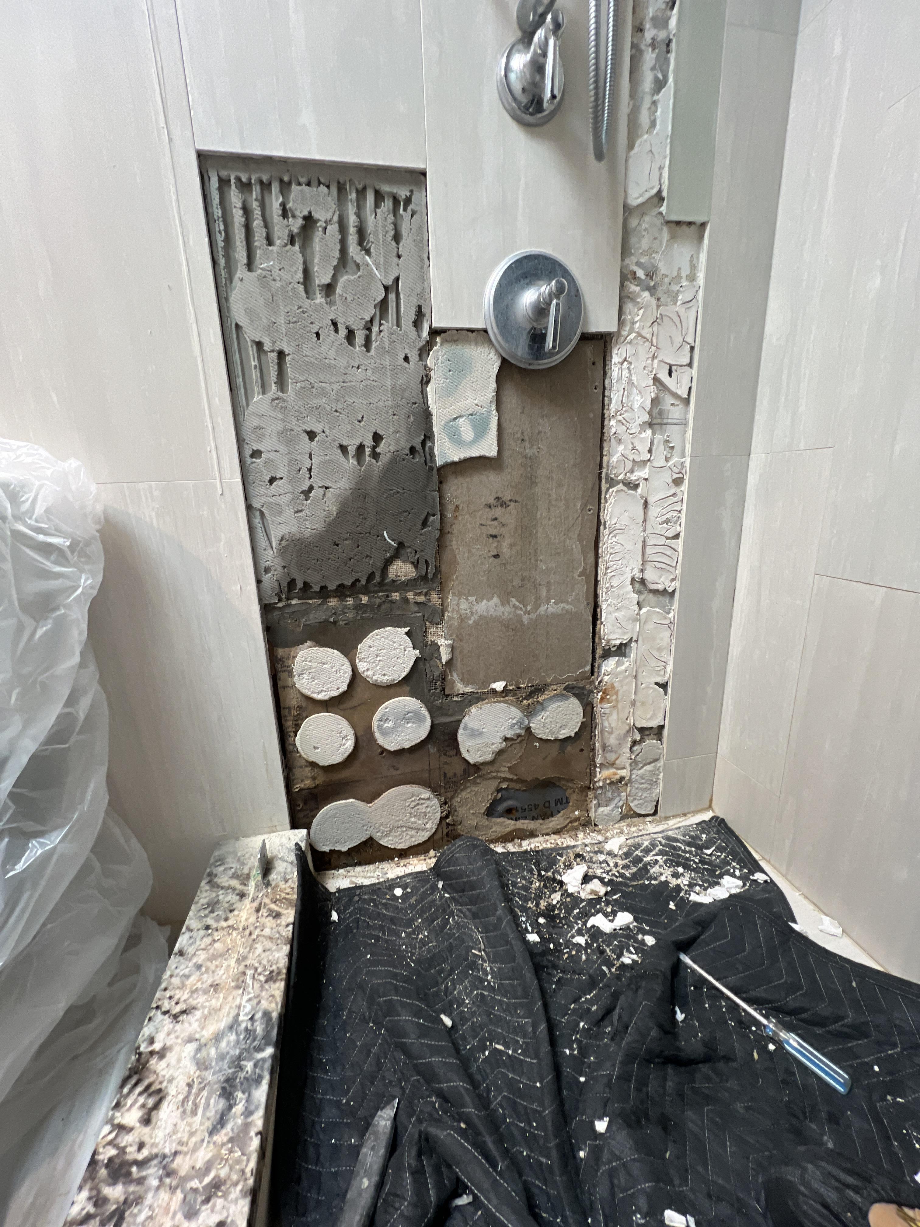 James reached out because he noticed a patch in his ceiling that looked wet. PDQ came in to investigate and located the leak coming from the shower handle in the upstairs bathroom.
