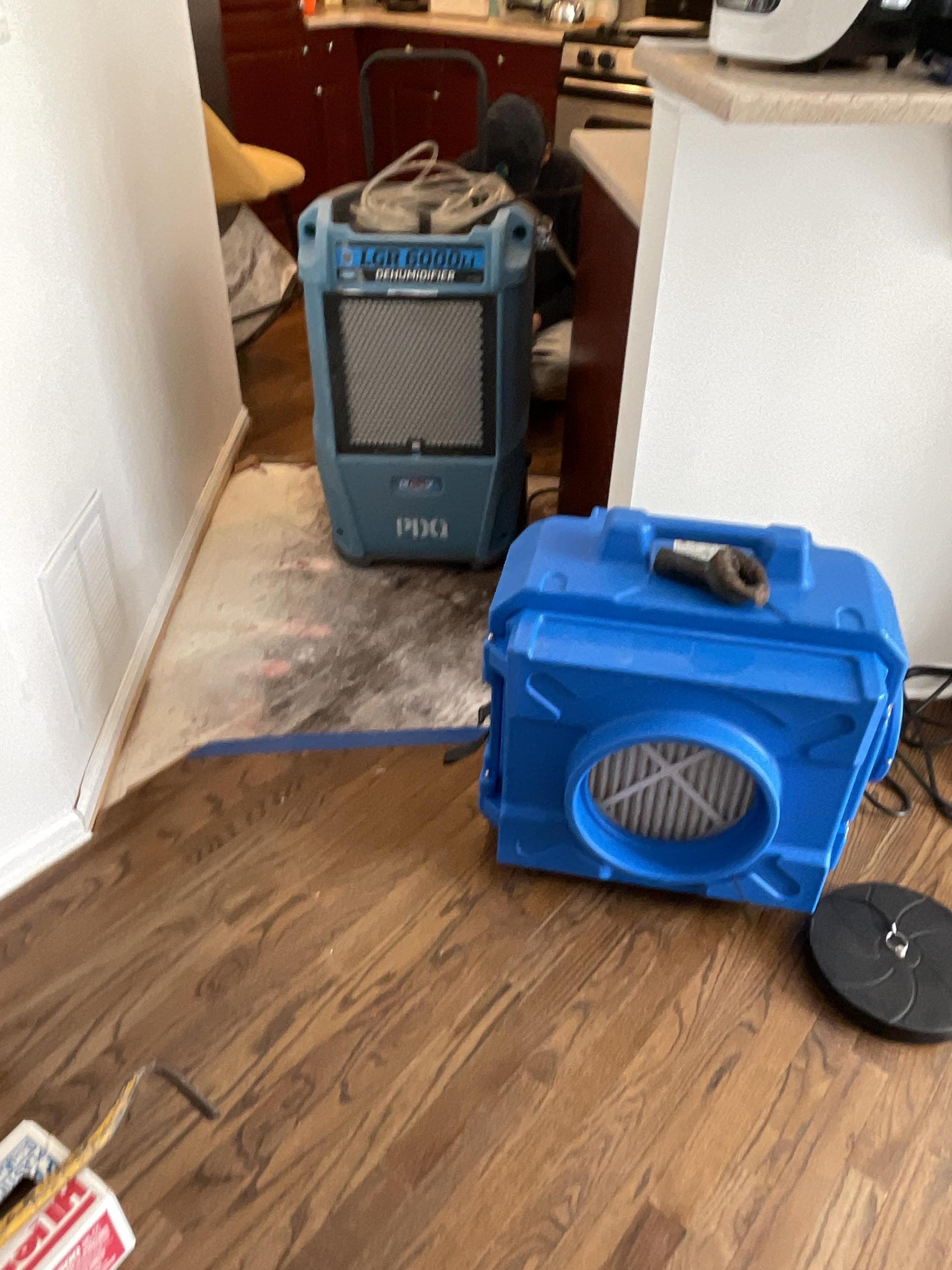 PDQ responded within the hour. Set up containment so that unaffected rooms in the house were not affected. We also set up dehumidifiers and air scrubber to stabilize the area. Removed the damaged wood floor, sprayed antimicrobial and dried out eh property. Took 5 days to reach the dry standard.