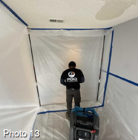 PDQ quickly arrived on site. After a through moisture inspection the technicians nicely moved the furniture and set up containment to create a chamber to do the demolition, cleaning and sanitizing as well as drying out the property. The upstairs hallway's carpet was also affected.