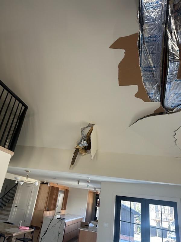 When Carlo's home in Madison, NJ, experienced a tree fall onto the roof, it led to significant water damage in the living room. Heavy rains followed the incident, allowing water to seep through the damaged roof, soaking the ceiling and floors. The drywall in the living room was noticeably damp, and the hardwood flooring began to warp from moisture exposure.