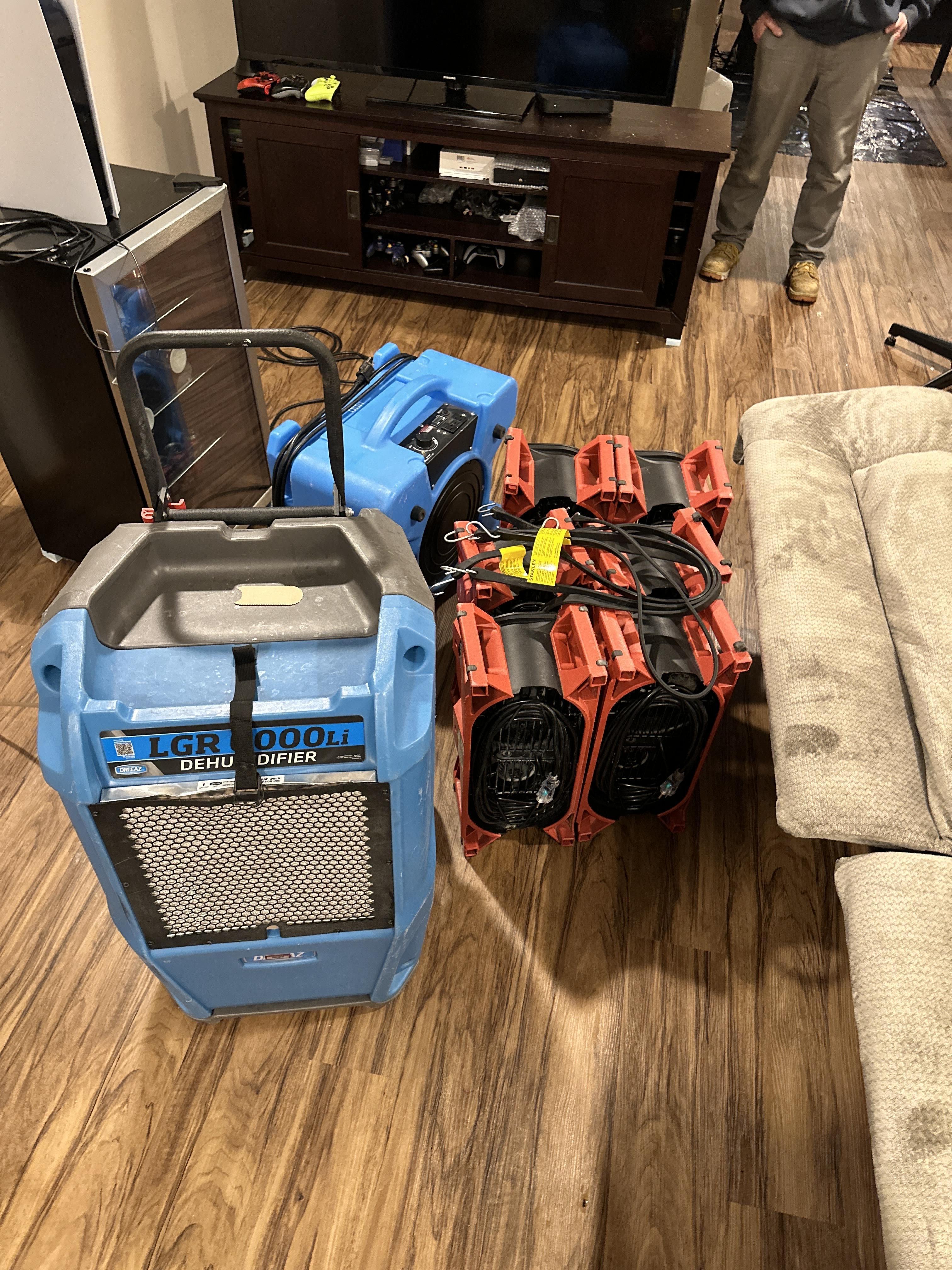When the PDQ Restoration team arrived at Maddie’s Brookside property, they quickly assessed the extent of the damage and removed the standing water from the affected areas. High-powered dehumidifiers and air movers were strategically placed to dry out the basement thoroughly, ensuring no moisture remained in the walls or flooring. The team also inspected hidden spaces around the closet to prevent mold from developing.
