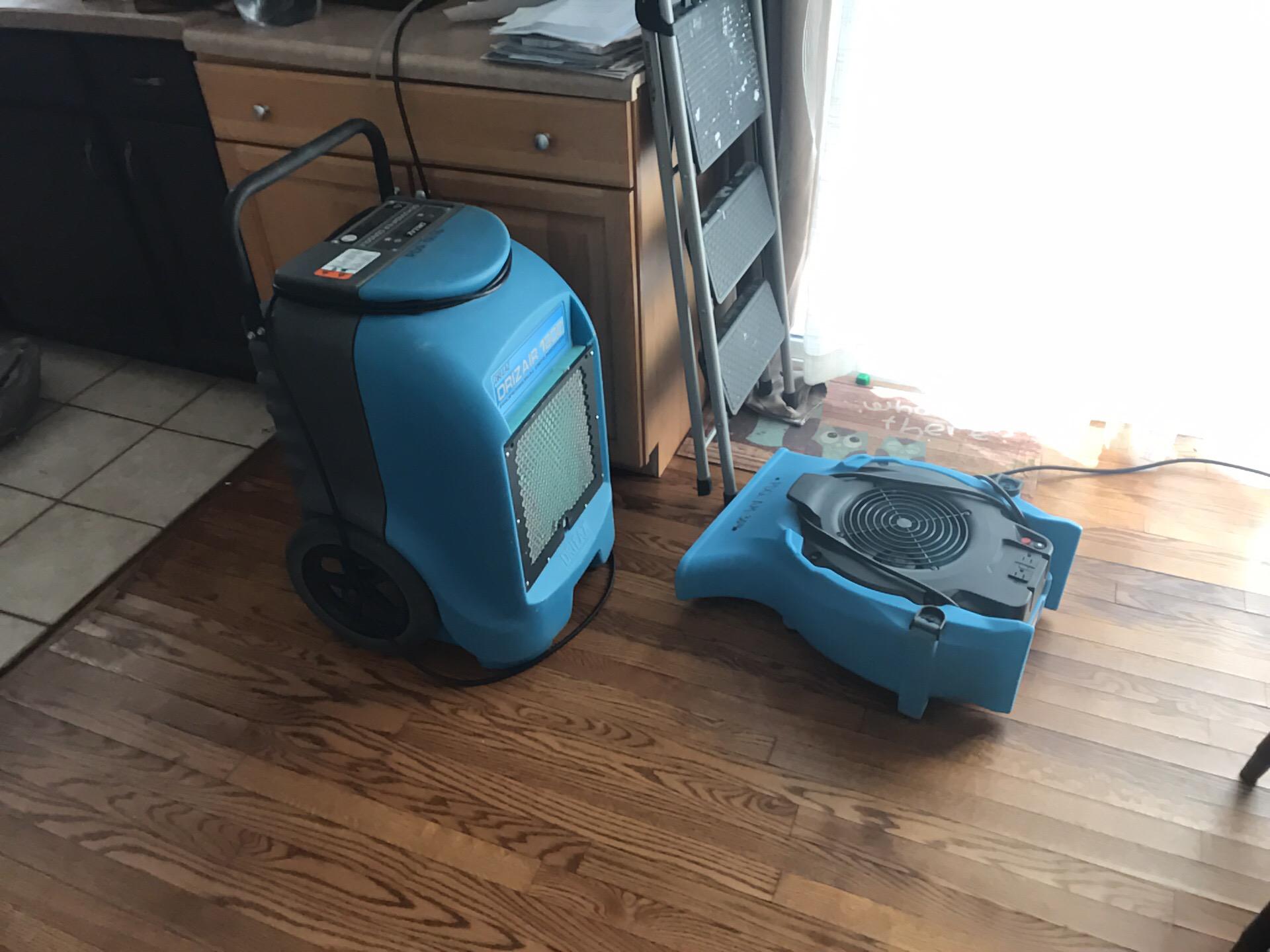 We then installed industrial-grade air movers and dehumidifiers to reduce humidity and dry out the saturated wood and subfloor. The underside of the sink cabinet was treated with antimicrobial agents to sanitize the area and stop mold from developing in the damp, enclosed space. Throughout the process, we performed daily moisture checks to ensure the environment was drying effectively and safely. Dana appreciated the clean, controlled approach, especially with containment in place to keep her kitchen functional during the work.