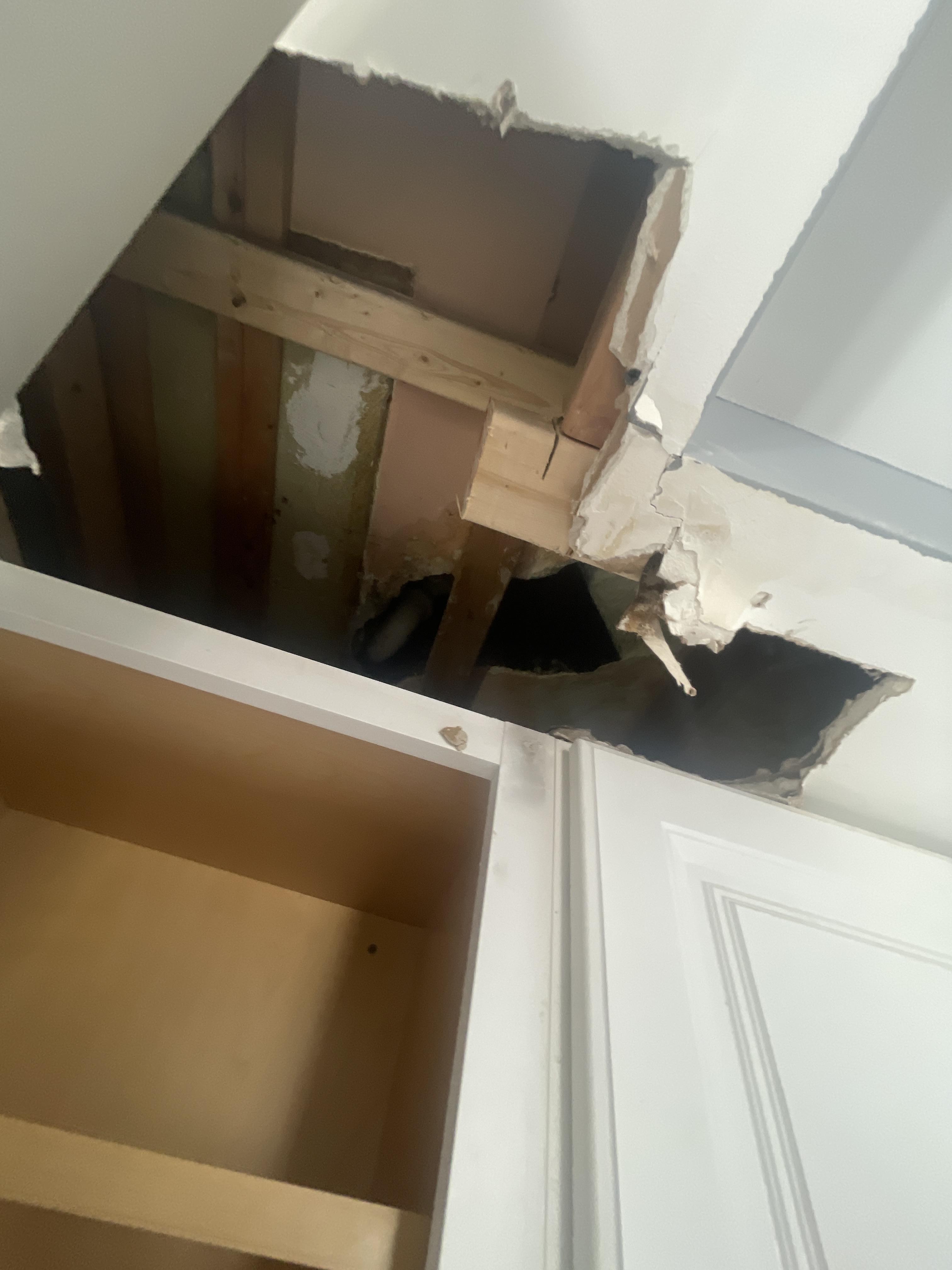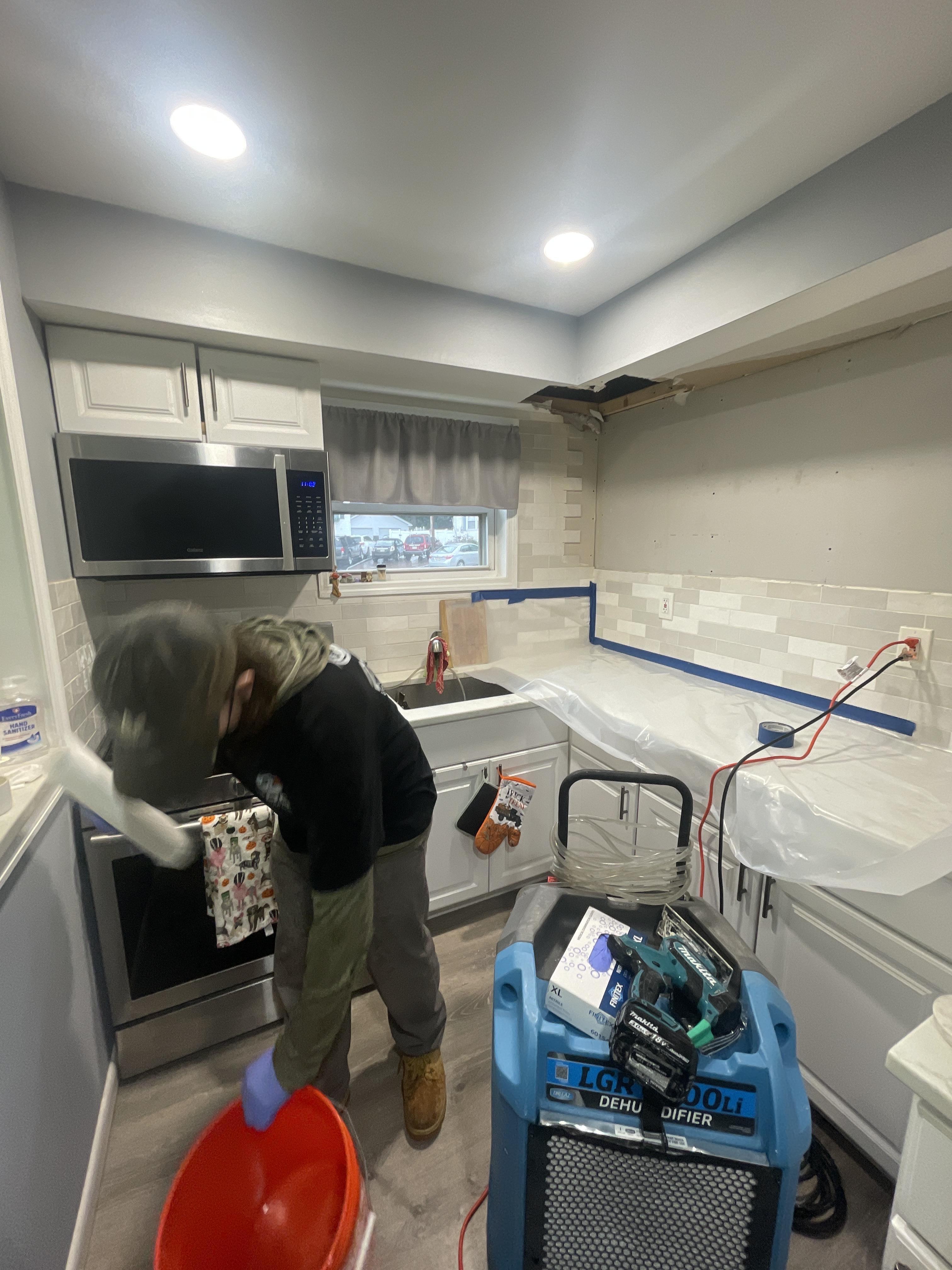 Jonathan L. reached out to PDQ Restoration after a burst pipe in the ceiling above his kitchen caused extensive water damage in his Hopatcong, NJ home. The ruptured pipe released a continuous flow of water that saturated the ceiling drywall, upper kitchen cabinets, and seeped into the hardwood flooring below. Our emergency team responded quickly to begin water extraction and to stabilize the affected area. Ceiling drywall was removed to access soaked insulation and allow for proper air circulation during the drying process. The water damage in this Hopatcong kitchen required detailed moisture mapping and structural drying to ensure all hidden moisture was eliminated.