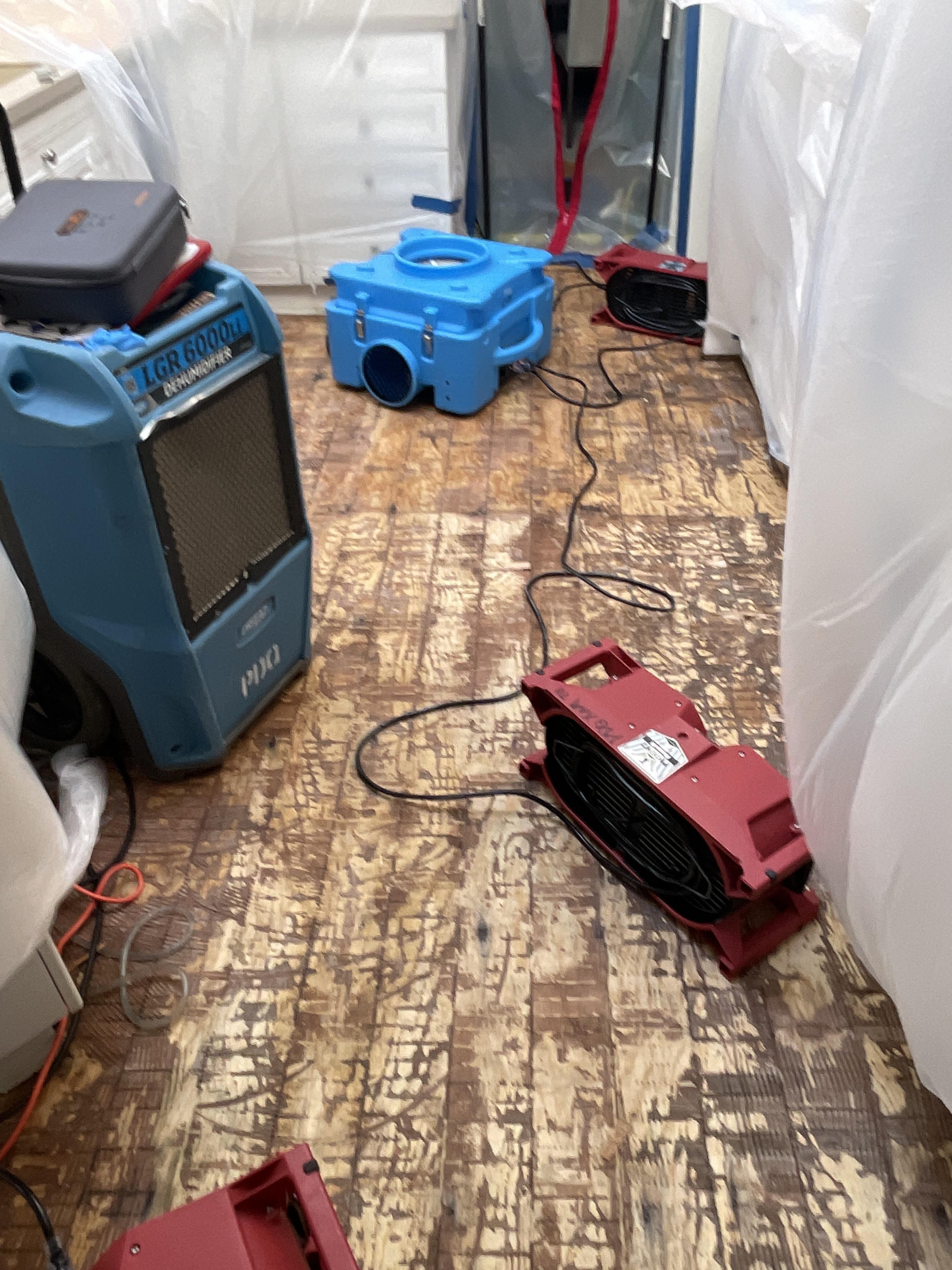Homeowner Jessica L. in Somerville, NJ encountered significant water damage after the kitchen sink trap suddenly broke, allowing water to flood the cabinet base and spread across the hardwood kitchen floor. The leak went unnoticed for several hours, resulting in warped floorboards, soaked subflooring, and water infiltration into the drywall behind the cabinetry. PDQ’s water damage restoration team arrived quickly in Somerville to begin water extraction, moisture detection, and emergency mitigation services. Technicians removed the saturated toe kicks and baseboards, opened up affected walls, and placed air movers and dehumidifiers to begin the structure drying process. Thermal imaging confirmed water migration into an adjacent hallway, prompting extended drying measures to prevent further damage.