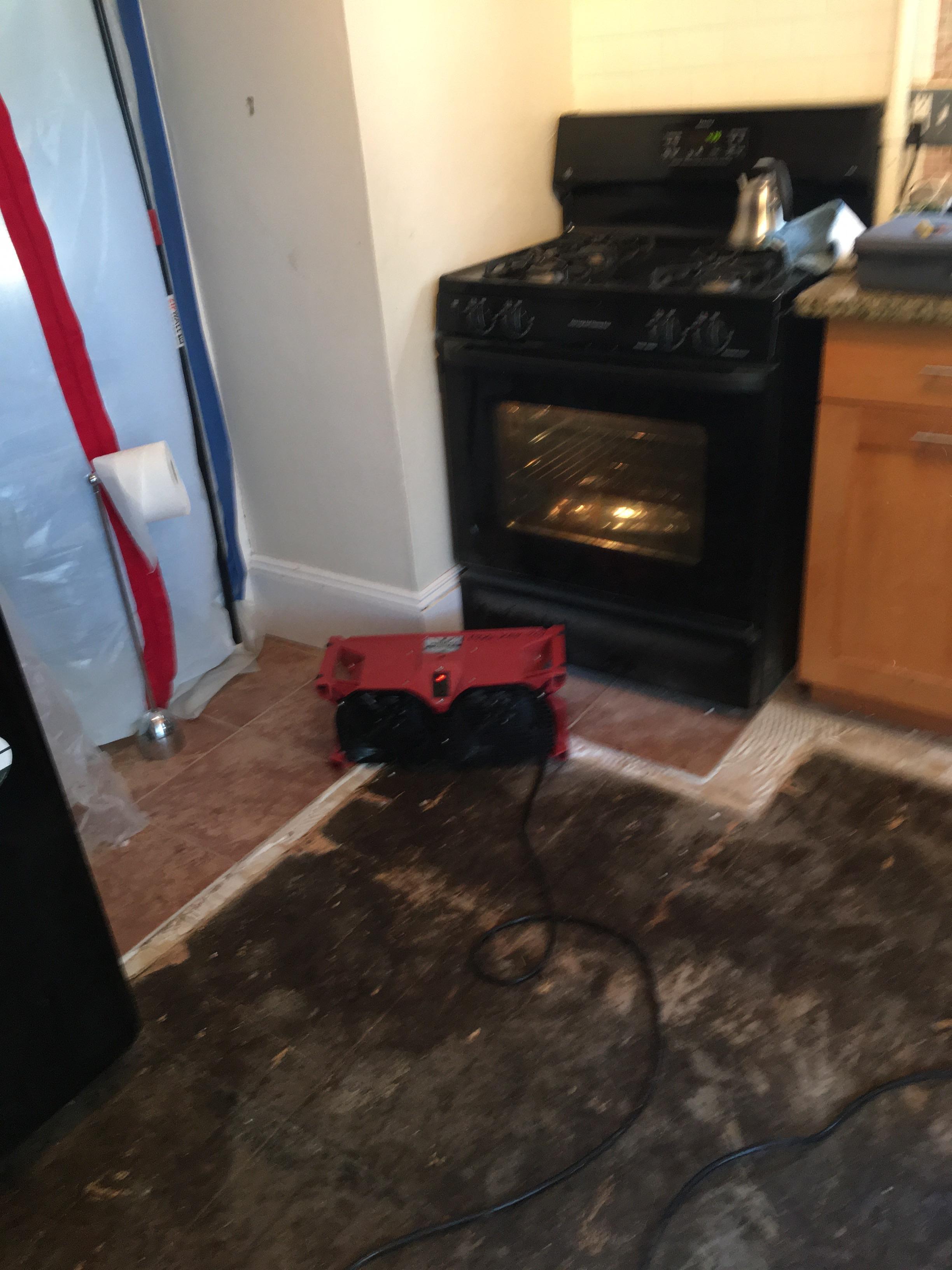Homeowner Allison J. in Rosemont, NJ suffered water damage after a pipe burst behind the wall in her kitchen, likely due to freezing temperatures causing the pipe to expand and crack. The concealed leak went unnoticed for several hours, saturating the wall cavity, base cabinets, and hardwood kitchen floor before pooling into adjacent rooms. PDQ’s water damage restoration team was called to the Rosemont property for emergency water extraction and structural drying. Technicians removed the water-damaged base cabinets and opened the drywall to access the source of the leak and assess the extent of the saturation. Commercial dehumidifiers and air movers were installed to dry the subfloor, wall studs, and surrounding materials.