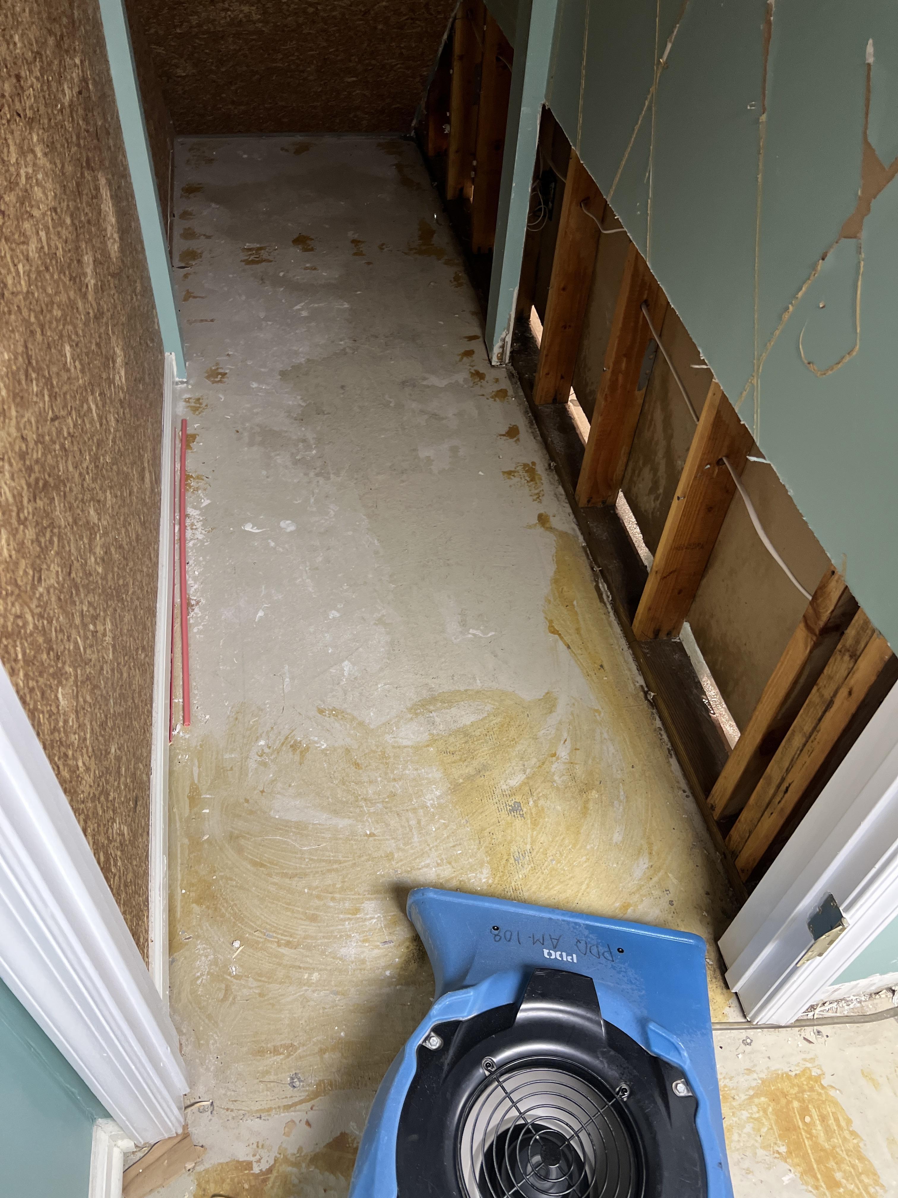 Homeowner Cheryl N. in Ridgefield Park, NJ experienced sudden water damage after the water intake pipe behind her upstairs toilet burst, flooding the bathroom and spreading into the adjacent hallway. The pressurized water quickly saturated the bathroom floor, hallway carpeting, and soaked into the subfloor and baseboards. PDQ’s water damage restoration team arrived in Ridgefield Park to perform immediate water extraction and assess the extent of the water migration. Technicians removed water-damaged baseboards and opened sections of drywall to dry wall cavities, while high-powered air movers and dehumidifiers were installed to address moisture in flooring and beneath the cabinetry.