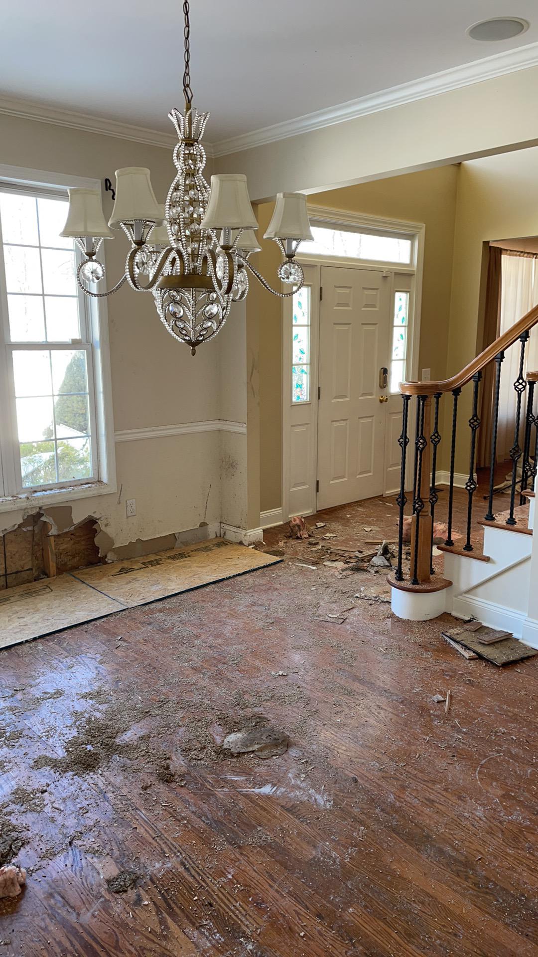 Homeowner Jared W. in Lafayette Township, NJ experienced significant water damage after a pipe burst in the foyer area, affecting the hardwood floor and adjacent interior wall. The sudden pipe failure caused water to pool across the entryway, quickly saturating the wood flooring and wicking up into the lower drywall and baseboards. PDQ Fire & Water Damage Restoration responded with emergency water extraction and deployed floor drying mats to salvage the hardwood. The Lafayette Township water damage restoration included controlled demolition of the affected wall section to remove wet insulation and begin structural drying. Industrial dehumidifiers and air movers were strategically positioned to ensure complete moisture removal in the impacted foyer area.