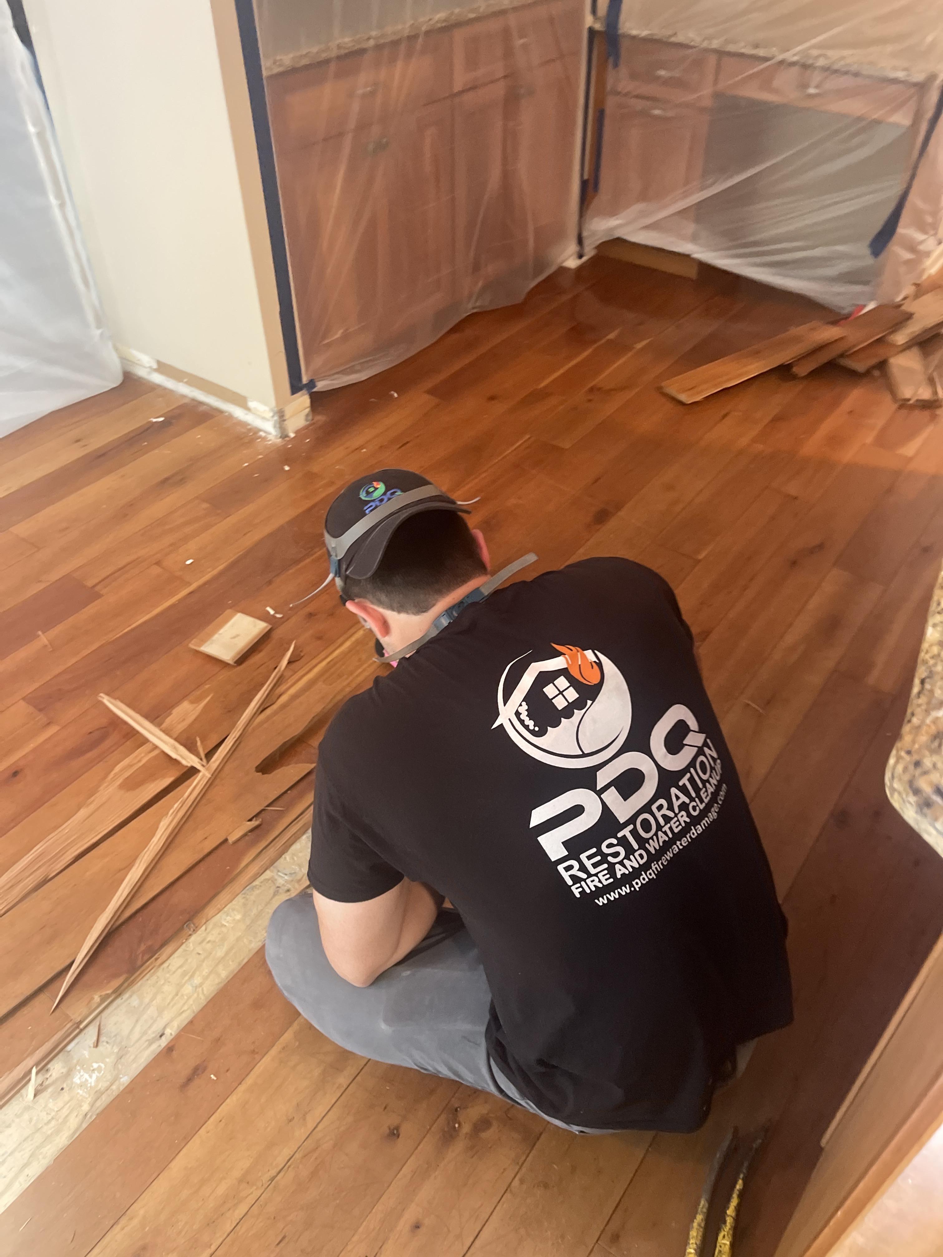Kevin S. contacted PDQ after discovering water damage in his Mendham, NJ home when sections of hardwood flooring began to cup and separate due to prolonged moisture exposure. The water damage in Mendham, NJ was caused by a hidden appliance leak that allowed water to migrate beneath the wood floors and into the subfloor over time. PDQ performed a comprehensive moisture inspection in the Mendham, NJ property using moisture meters to identify elevated readings beneath the finished flooring and along adjacent base areas. Affected hardwood flooring was carefully removed to access trapped moisture and prevent further deterioration of the subfloor. Water Extraction was completed where moisture was present, and damaged flooring materials were removed as part of the water damage mitigation process. This Mendham, NJ water damage loss was documented and approved through the homeowner’s insurance for a water damage insurance claim.