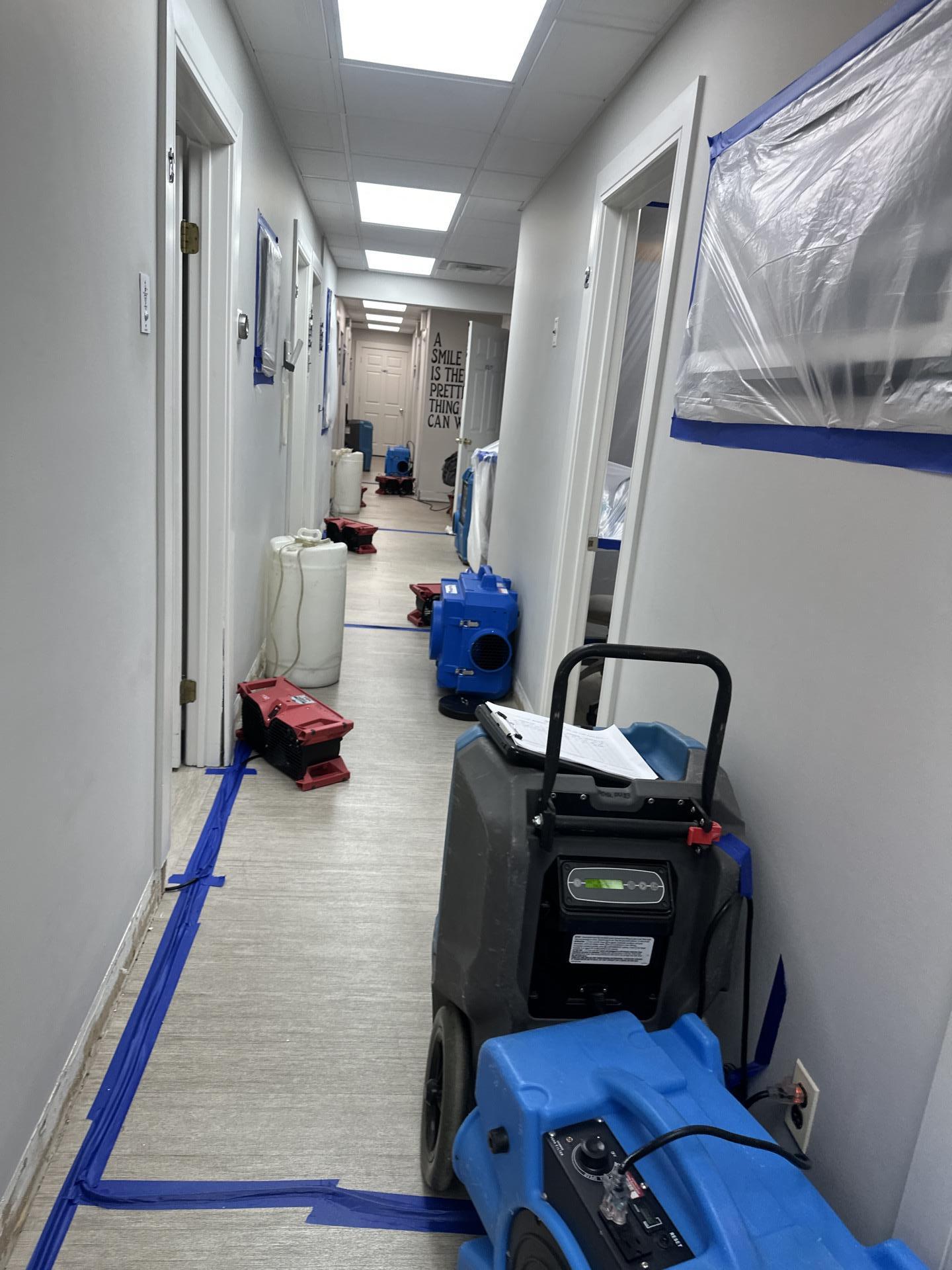 The PDQ restoration team immediately began the water damage mitigation process in Dover, NJ by establishing containment areas and protecting unaffected portions of the office. Baseboards were carefully removed and small access points were created along the lower drywall to allow trapped moisture to escape from the wall cavities. Commercial air movers and industrial dehumidifiers were strategically installed throughout the hallway and adjoining rooms to accelerate evaporation and support the structural drying process in Dover, NJ. Specialized drying equipment was positioned along the walls to target moisture trapped beneath the flooring system and behind drywall materials. Technicians performed daily moisture monitoring using professional moisture detection equipment to ensure the water damage in Dover, NJ was progressing through the proper drying stages. After several days of controlled structural drying and humidity management, the hallway and surrounding rooms returned to safe moisture levels, completing the water damage restoration project in Dover, NJ.