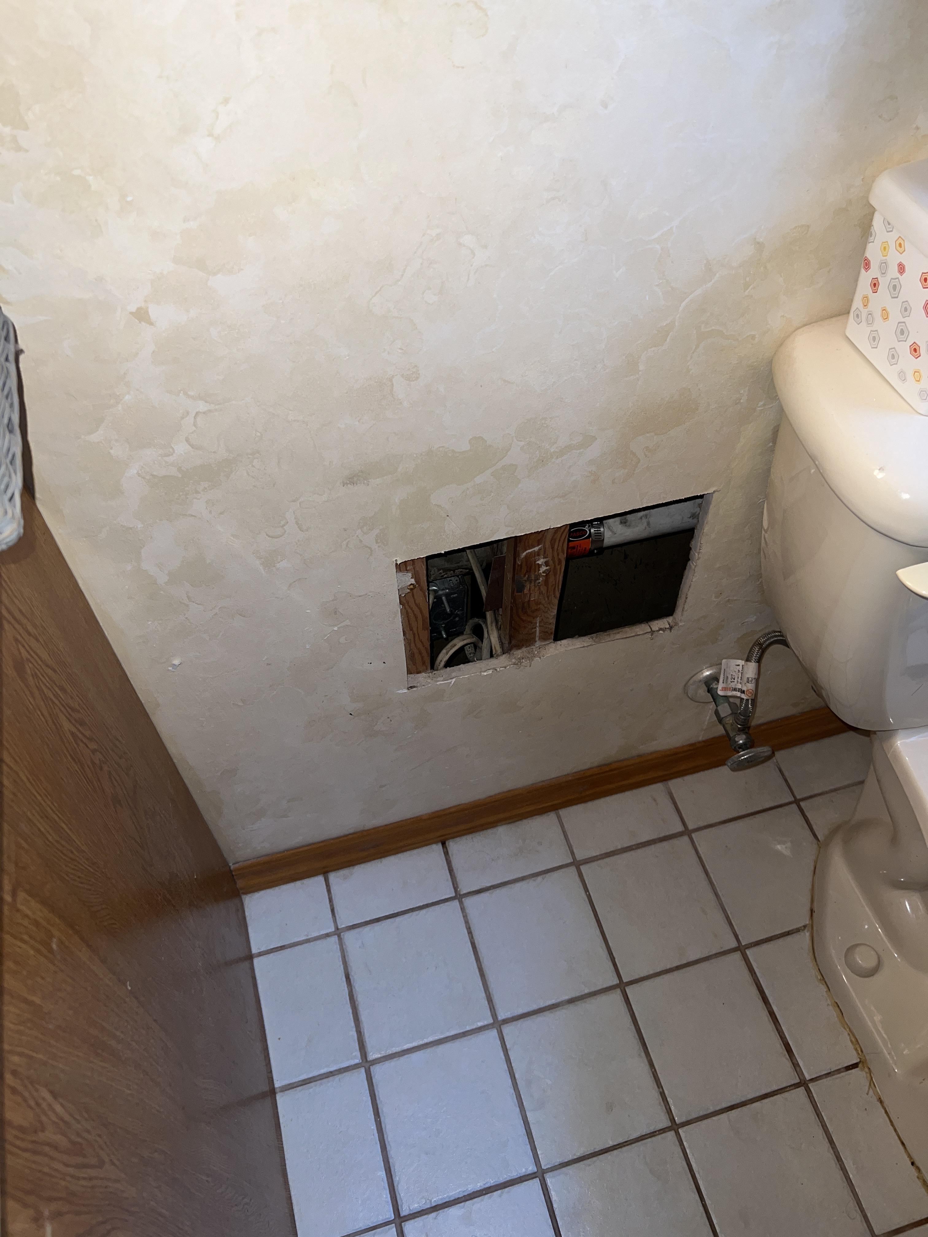 Nicole G. contacted PDQ Fire & Water Damage Restoration after discovering water damage in her Parsippany, NJ bathroom caused by a leaking pipe hidden behind the wall near the toilet supply line. The slow Water Pipe Break allowed moisture to build up the wall cavity, leading to visible staining, soft drywall, and elevated humidity levels throughout the Parsippany, NJ property. Upon arrival at the Parsippany, NJ home, technicians performed a detailed moisture inspection and used advanced detection equipment to confirm water intrusion behind the wall and along the floor. Controlled demolition was initiated, as shown, to open the affected wall cavity and expose saturated materials for proper drying in Parsippany, NJ. Emergency water extraction and containment procedures were implemented to prevent further spread of moisture. Wet insulation and damaged drywall were carefully removed to reduce the risk of mold growth and structural deterioration in the Parsippany, NJ residence. High-powered air movers and commercial dehumidifiers were strategically placed to begin the structure drying process.