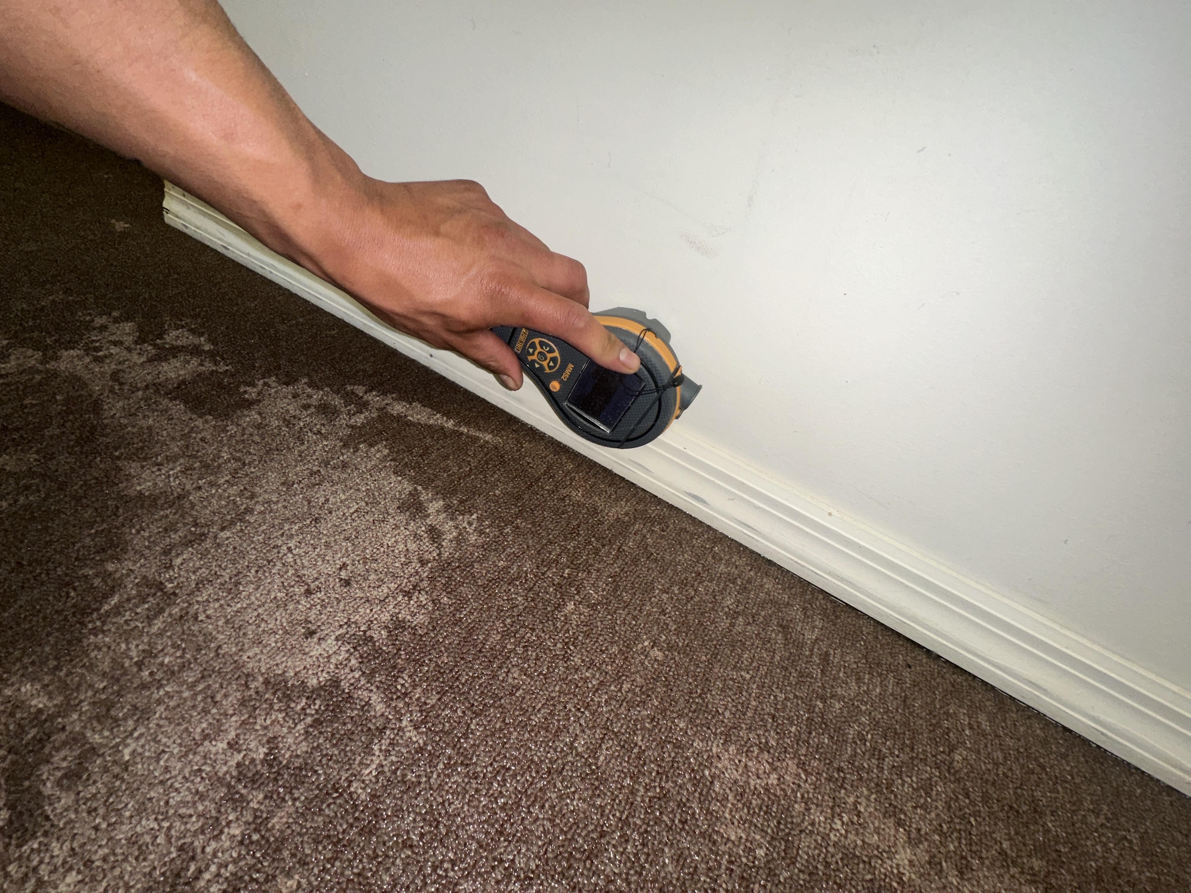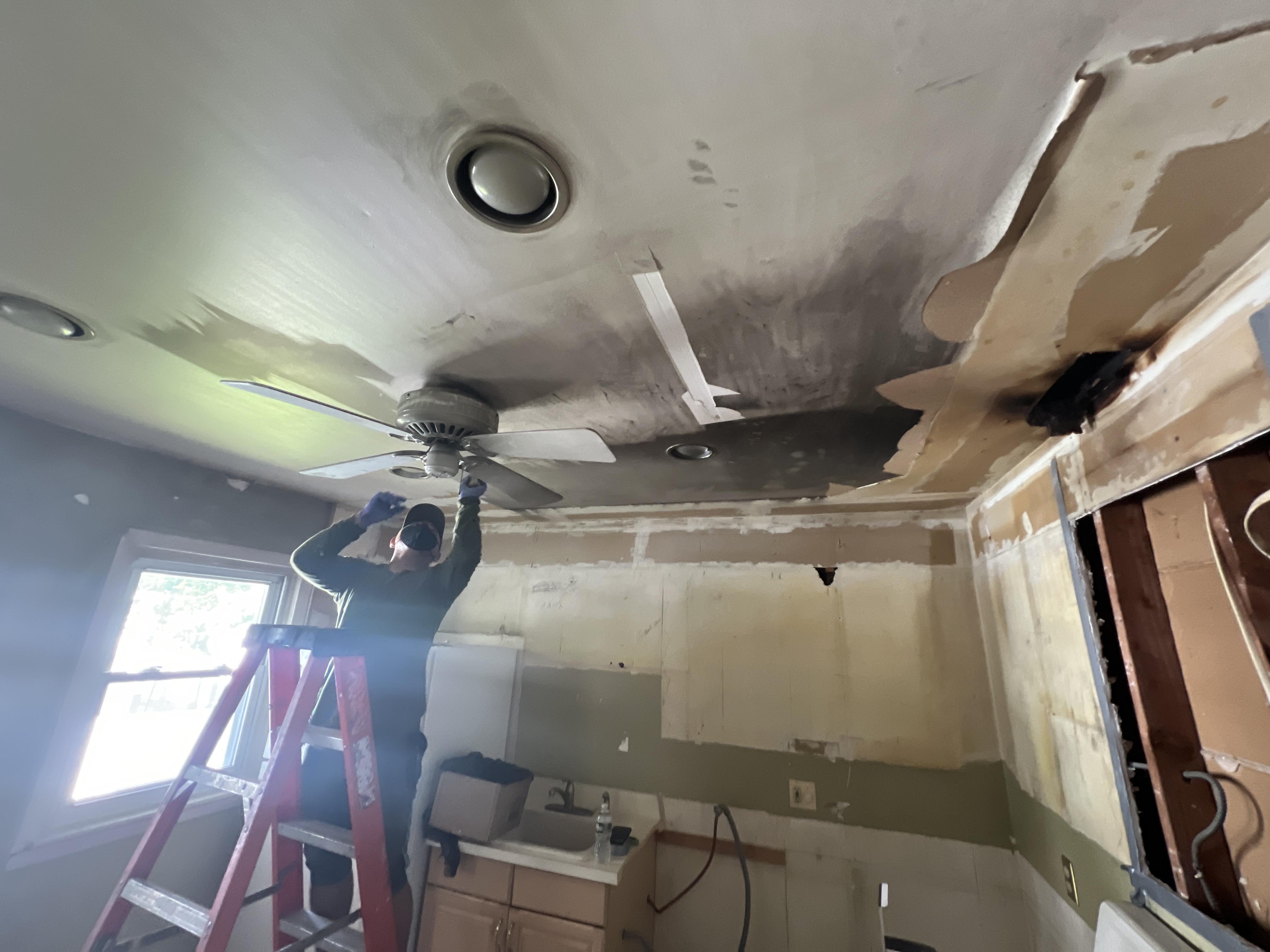 PDQ contained the damaged areas in the kitchen and family room and completed water damage mitigation at the home in Morristown, New Jersey. The PDQ team searched for additional mold evidence on the ceiling in the living room/kitchen. Moisture was detected in the subfloor which required fans to be installed from the ceiling. The water-damaged carpet was pulled up during demolition and removed.