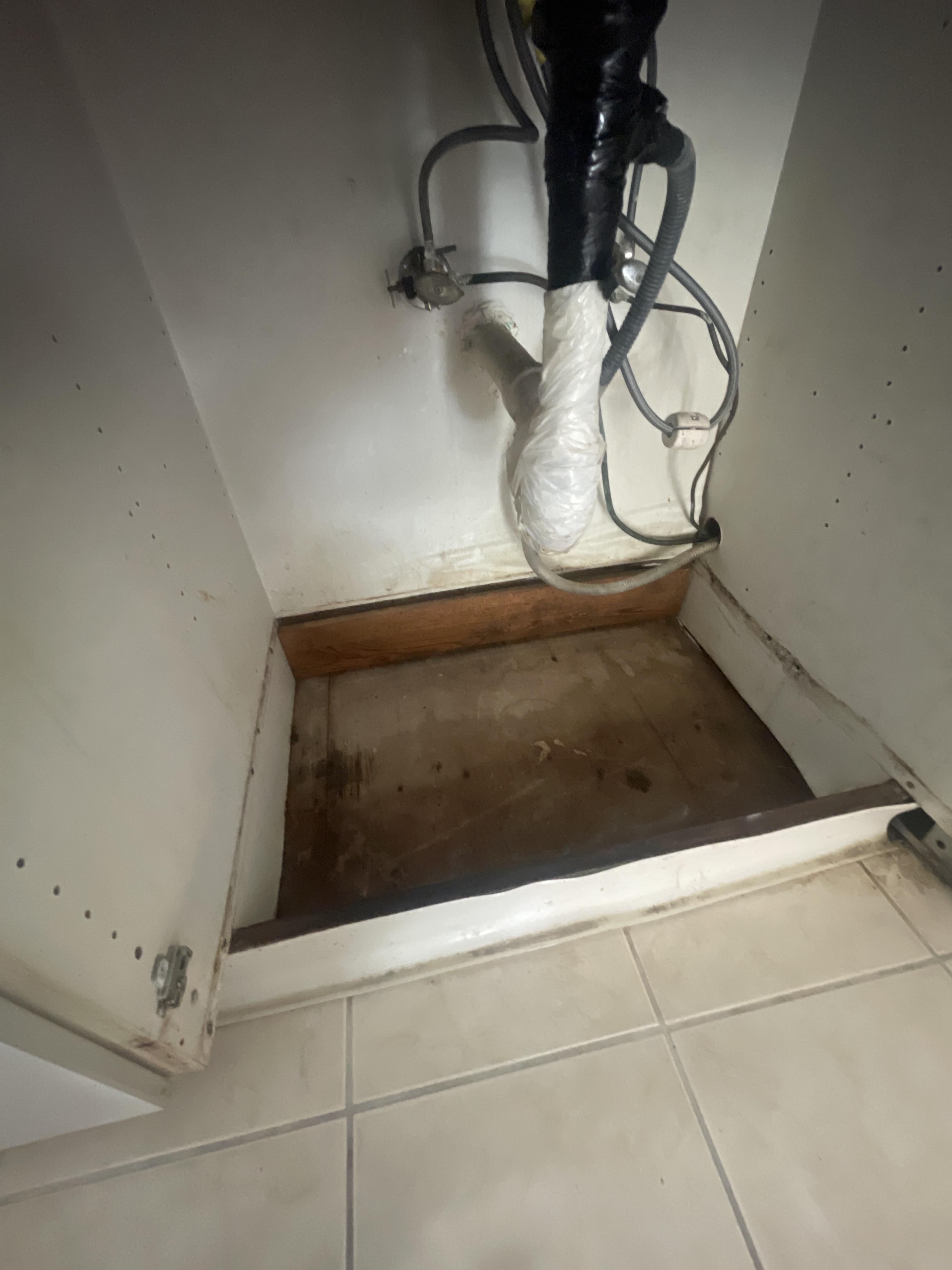 Homeowner Michelle L. in Ironia, NJ discovered extensive water damage in her kitchen after a pipe beneath the kitchen sink began leaking overnight. The pressurized line released water that flooded the tile floor and seeped beneath cabinetry, baseboards, and kitchen appliances. By the time the leak was discovered, standing water had formed across much of the kitchen, and moisture had begun wicking up into the drywall. Our water damage restoration team responded promptly to perform water extraction, remove the toe kicks beneath the cabinets, and assess damage behind and under the sink base. Moisture readings confirmed that water had penetrated the subfloor and surrounding areas.