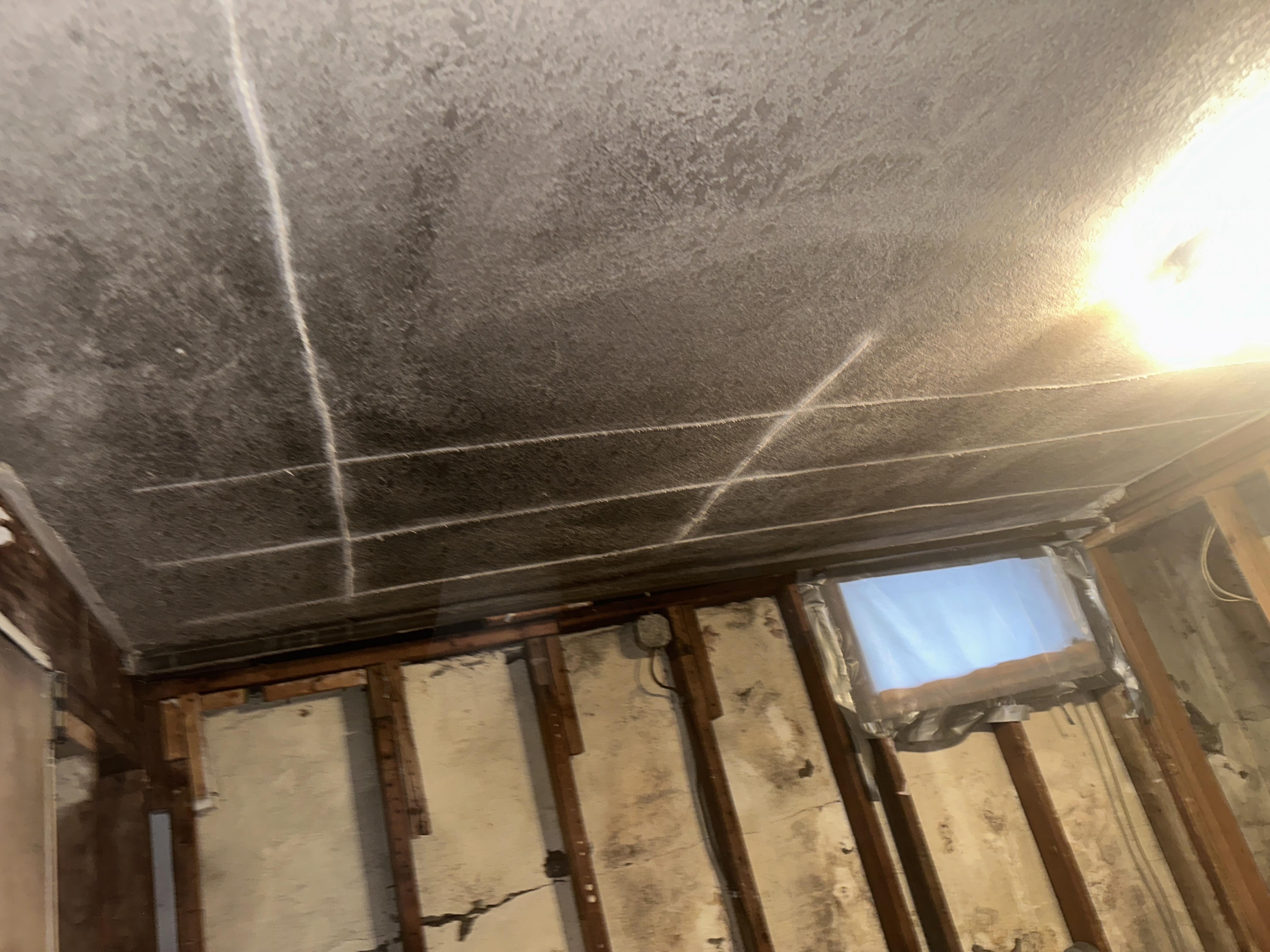 Homeowner Diane H. called us after a burst pipe in the ceiling caused extensive water damage in the unfinished basement of her Morris Plains, NJ home. The pipe ruptured during a cold snap, releasing a steady stream of water that pooled across the concrete floor and soaked exposed insulation, framing, and stored belongings. Our water damage restoration team arrived quickly to perform water extraction and begin structural drying using industrial dehumidifiers and high-powered air movers. We removed saturated insulation and treated wood framing with antimicrobial agents to prevent microbial growth. Moisture detection confirmed elevated levels in the ceiling cavity, which required additional drying and partial demolition for full access.
