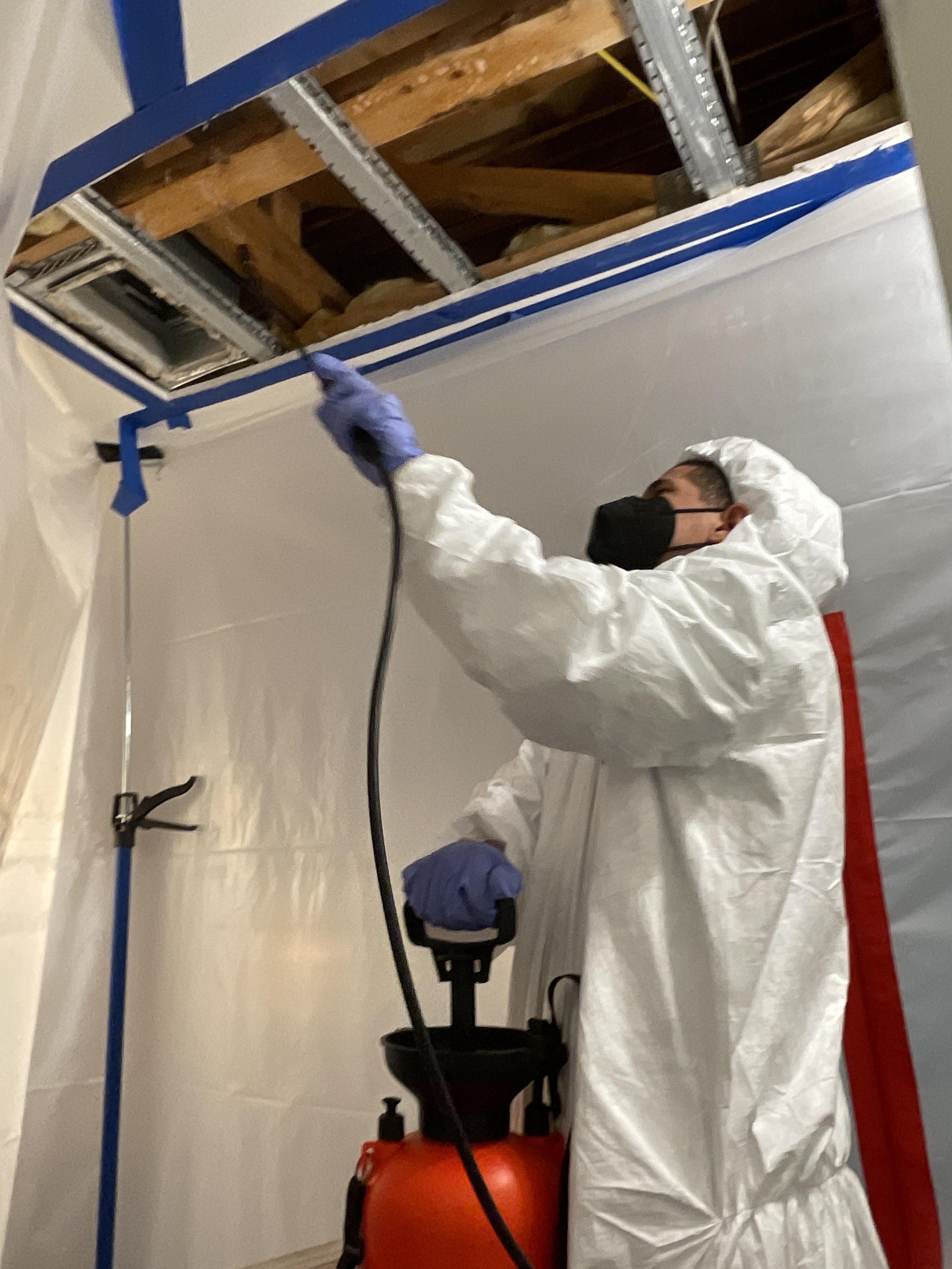 After PDQ arrived at the house in Chatham, NJ the first step was to place stabilization equipment. This included dehumidifers, fans, and HEPA air scrubbers. After this was done containment was set up around the wet and affected area. The demo team wa...