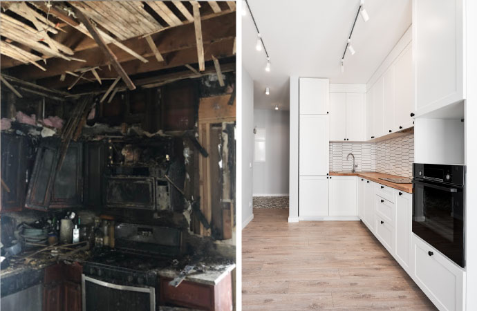 A damaged kitchen can disrupt your entire home. Our kitchen repair and rebuild services focus on restoring cabinets, countertops, flooring, and fixtures. After water damage restoration or fire cleanup, we begin the reconstruction process with new drywall, fresh paint, and replacement of flooring or cabinetry as needed. From minor wall repairs to full remodels, we coordinate with your insurance carrier to ensure your scope of work reflects your needs and budget.