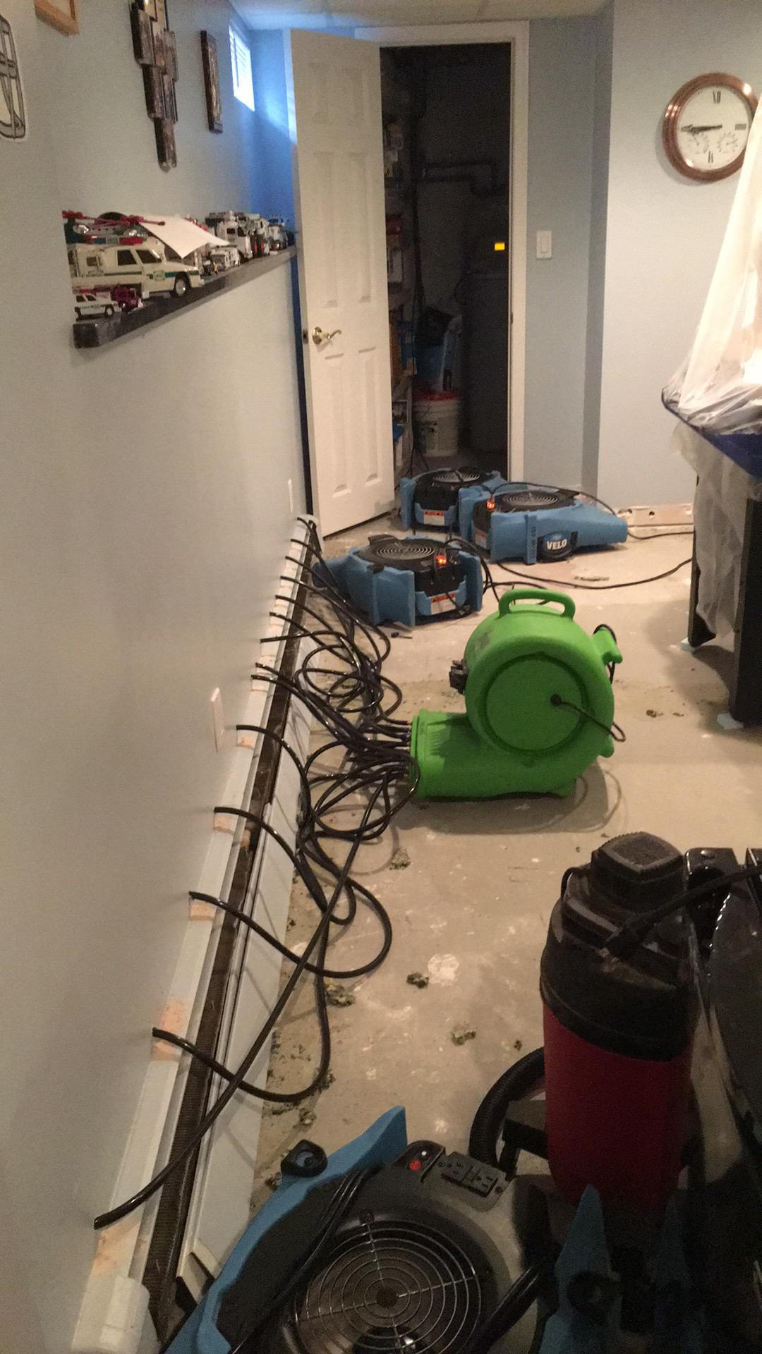 The Drying & Dehumidification process begins by setting up drying chambers, which isolate affected areas to create an optimal drying environment. Industrial-grade low-grain refrigerant (LGR) dehumidifiers and desiccant dehumidifiers are strategically placed to remove excess moisture from the air, accelerating the drying process while preventing secondary water damage and mold growth. High-velocity air movers are used to enhance evaporation, while moisture meters and thermal imaging cameras monitor progress to ensure hidden moisture is eliminated. By maintaining controlled humidity levels and adhering to industry-standard drying protocols, we guarantee thorough dehumidification that structural weakening, warping, and microbial growth has been prevented. Our equipment is not removed until the property meets the Dry Standard, ensuring a safe and complete restoration.
