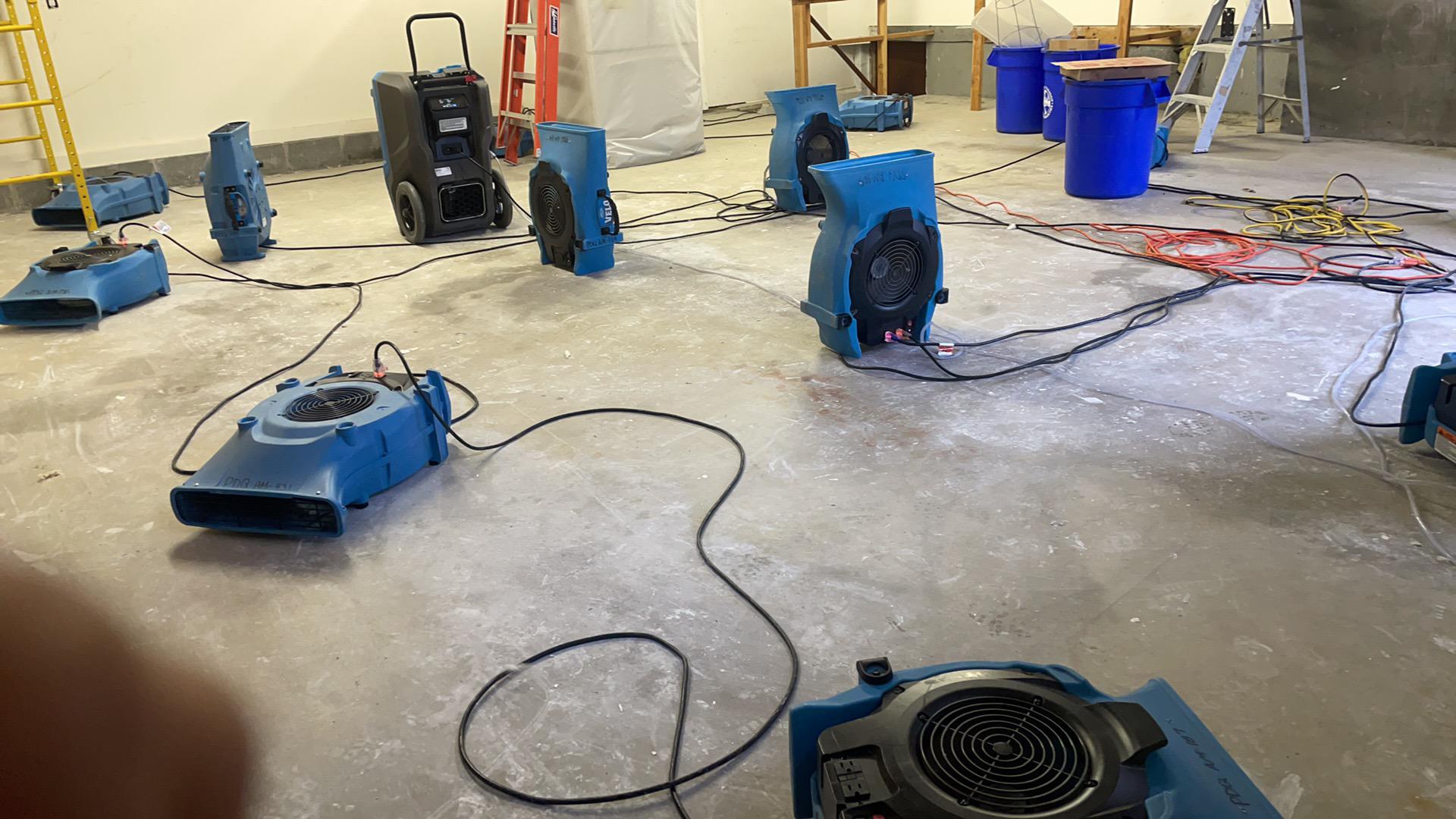 The Drying & Dehumidification process begins by setting up drying chambers, which isolate affected areas to create an optimal drying environment. Industrial-grade low-grain refrigerant (LGR) dehumidifiers and desiccant dehumidifiers are strategically placed to remove excess moisture from the air, accelerating the drying process while preventing secondary water damage and mold growth. High-velocity air movers are used to enhance evaporation, while moisture meters and thermal imaging cameras monitor progress to ensure hidden moisture is eliminated. By maintaining controlled humidity levels and adhering to industry-standard drying protocols, we guarantee thorough dehumidification that structural weakening, warping, and microbial growth has been prevented. Our equipment is not removed until the property meets the Dry Standard, ensuring a safe and complete restoration.