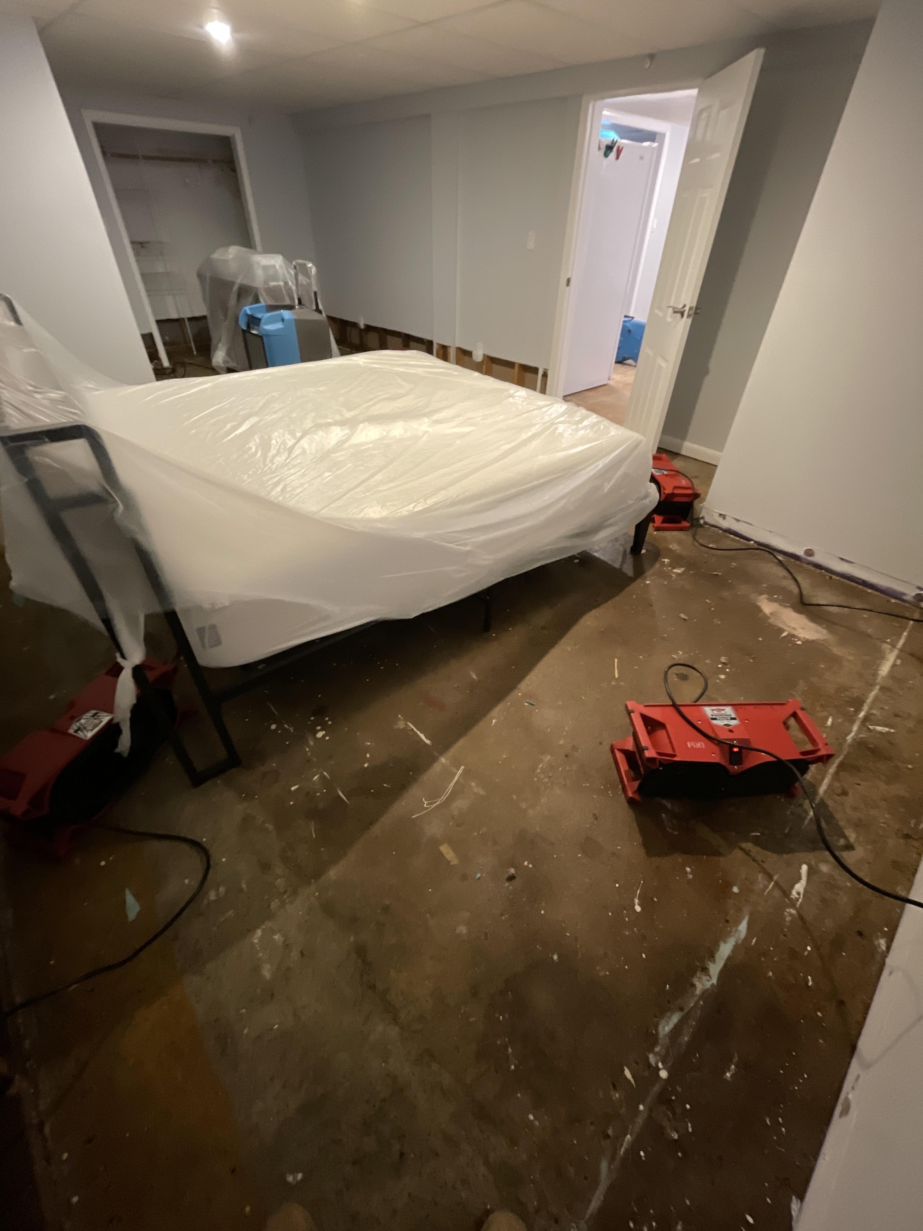 When the PDQ Restoration team arrived at Lloyd’s home in Baptistown, they immediately assessed the extent of the water damage. High-powered pumps were used to remove the standing water, followed by industrial-grade dehumidifiers and air movers to dry the bedroom thoroughly. The team carefully removed sections of the walls and flooring to access and eliminate all trapped moisture. Antimicrobial treatments were applied to prevent the growth of mold and bacteria, ensuring the space was safe for future use. Regular moisture checks were conducted to confirm the area was completely dry before repairs began. Over the course of four days, PDQ restored the space, with Lloyd’s insurance covering most of the costs, leaving him responsible only for the deductible. Thanks to PDQ’s quick and effective response, the basement bedroom in Lloyd’s Baptistown, NJ home was fully restored and ready to use again.