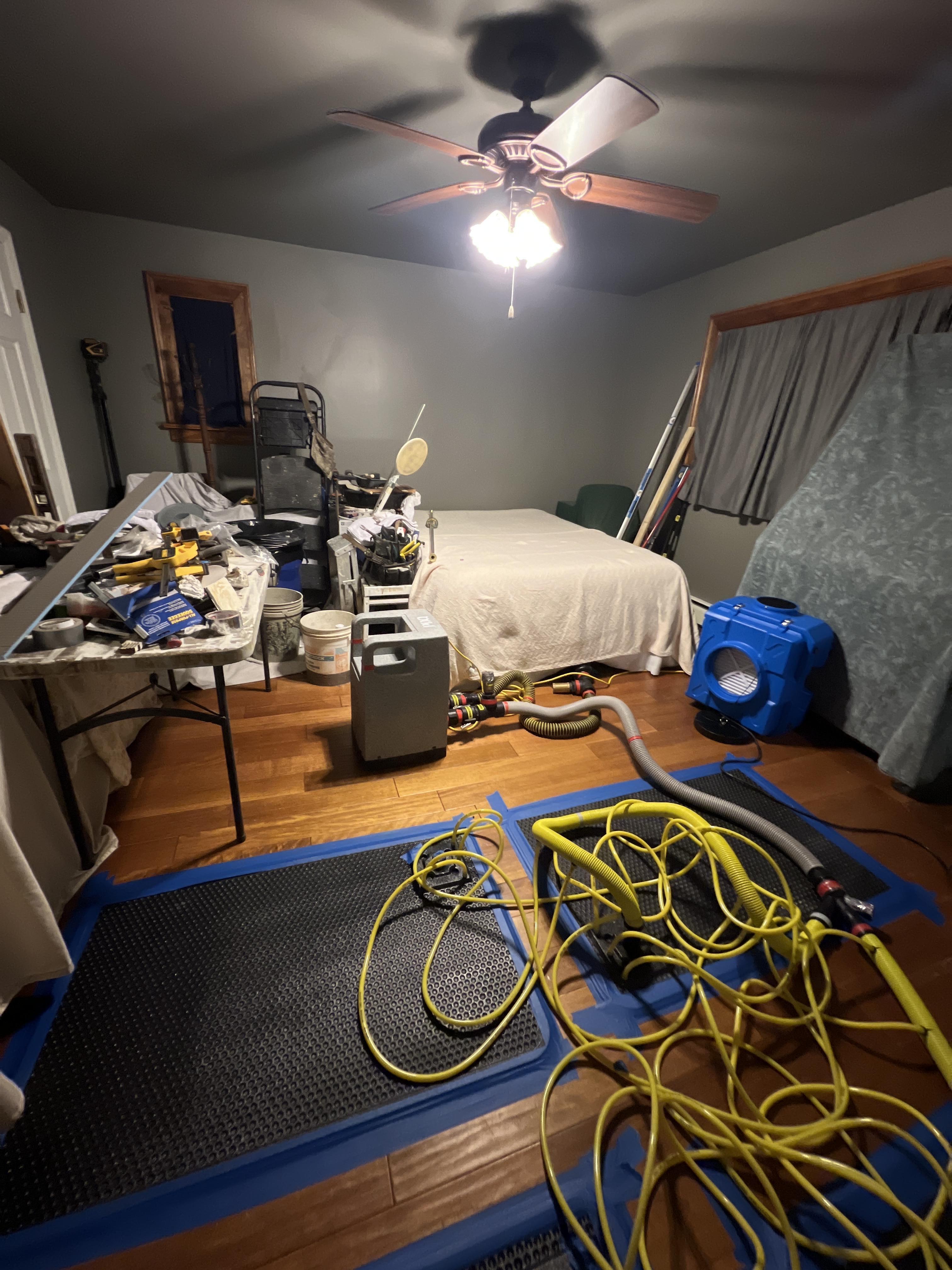The Drying & Dehumidification process begins by setting up drying chambers, which isolate affected areas to create an optimal drying environment. Industrial-grade low-grain refrigerant (LGR) dehumidifiers and desiccant dehumidifiers are strategically placed to remove excess moisture from the air, accelerating the drying process while preventing secondary water damage and mold growth. High-velocity air movers are used to enhance evaporation, while moisture meters and thermal imaging cameras monitor progress to ensure hidden moisture is eliminated. By maintaining controlled humidity levels and adhering to industry-standard drying protocols, we guarantee thorough dehumidification that structural weakening, warping, and microbial growth has been prevented. Our equipment is not removed until the property meets the Dry Standard, ensuring a safe and complete restoration.