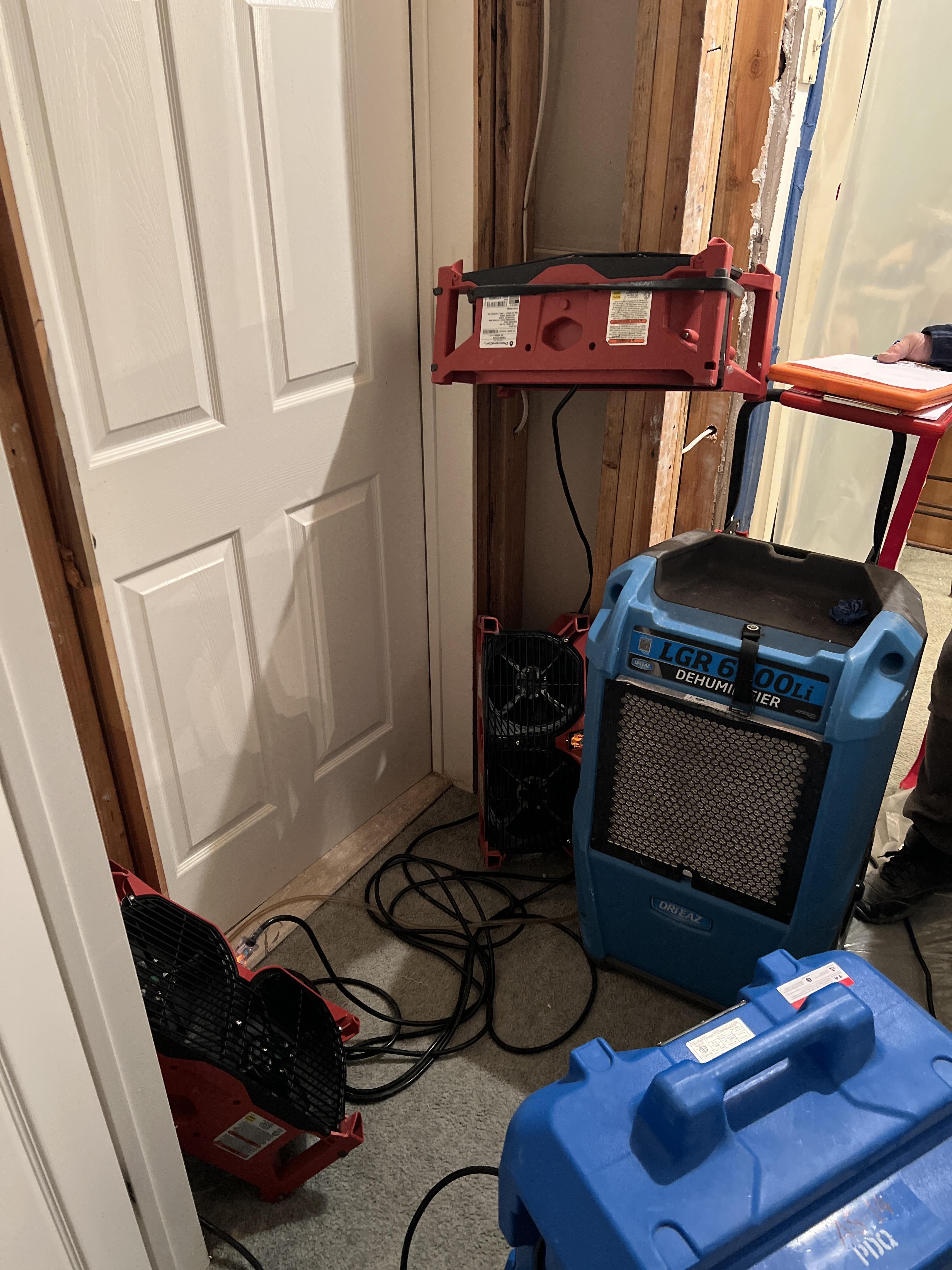 The Drying & Dehumidification process begins by setting up drying chambers, which isolate affected areas to create an optimal drying environment. Industrial-grade low-grain refrigerant (LGR) dehumidifiers and desiccant dehumidifiers are strategically placed to remove excess moisture from the air, accelerating the drying process while preventing secondary water damage and mold growth. High-velocity air movers are used to enhance evaporation, while moisture meters and thermal imaging cameras monitor progress to ensure hidden moisture is eliminated. By maintaining controlled humidity levels and adhering to industry-standard drying protocols, we guarantee thorough dehumidification that structural weakening, warping, and microbial growth has been prevented. Our equipment is not removed until the property meets the Dry Standard, ensuring a safe and complete restoration.